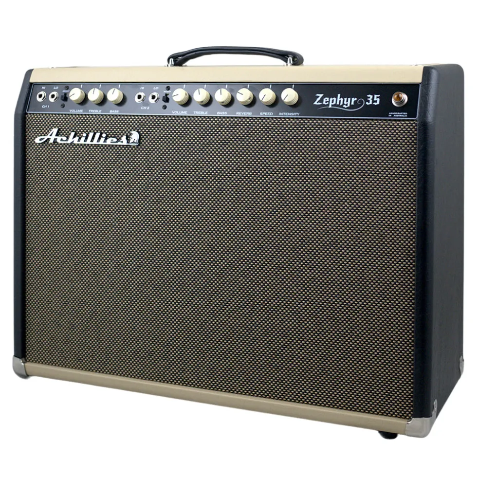 This Zephyr 35 is almost the middle child in the Zephyr family, but there’s no middle child syndrome here! This circuit sports two 6L6’s in the output section, driving 35w of luscious Californian mid-scooped tone through a 1 x 10” and a 1 x 12 Jensen Vintage Ceramics for ultimate tonal flexibility!
