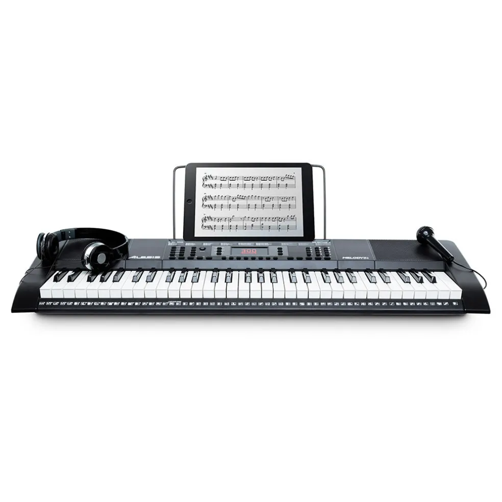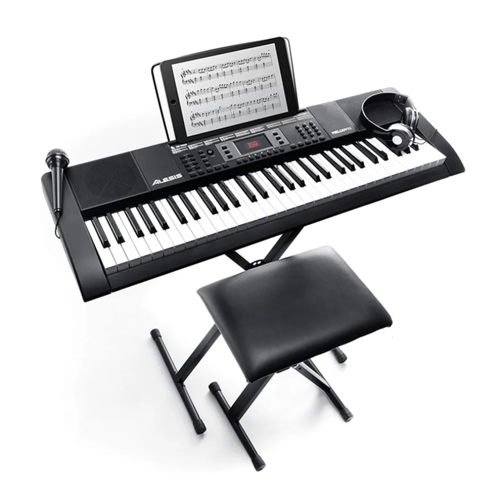 Melody 61 MKII includes every accessory that you need to get started and learn to play today. Melody 61 MKII comes with an easy-to-assemble stand, a bench with three adjustable height settings, headphones that automatically mute the speakers for private practice, a music rest for holding sheet music, a power adapter and even a microphone for singing along while you play!