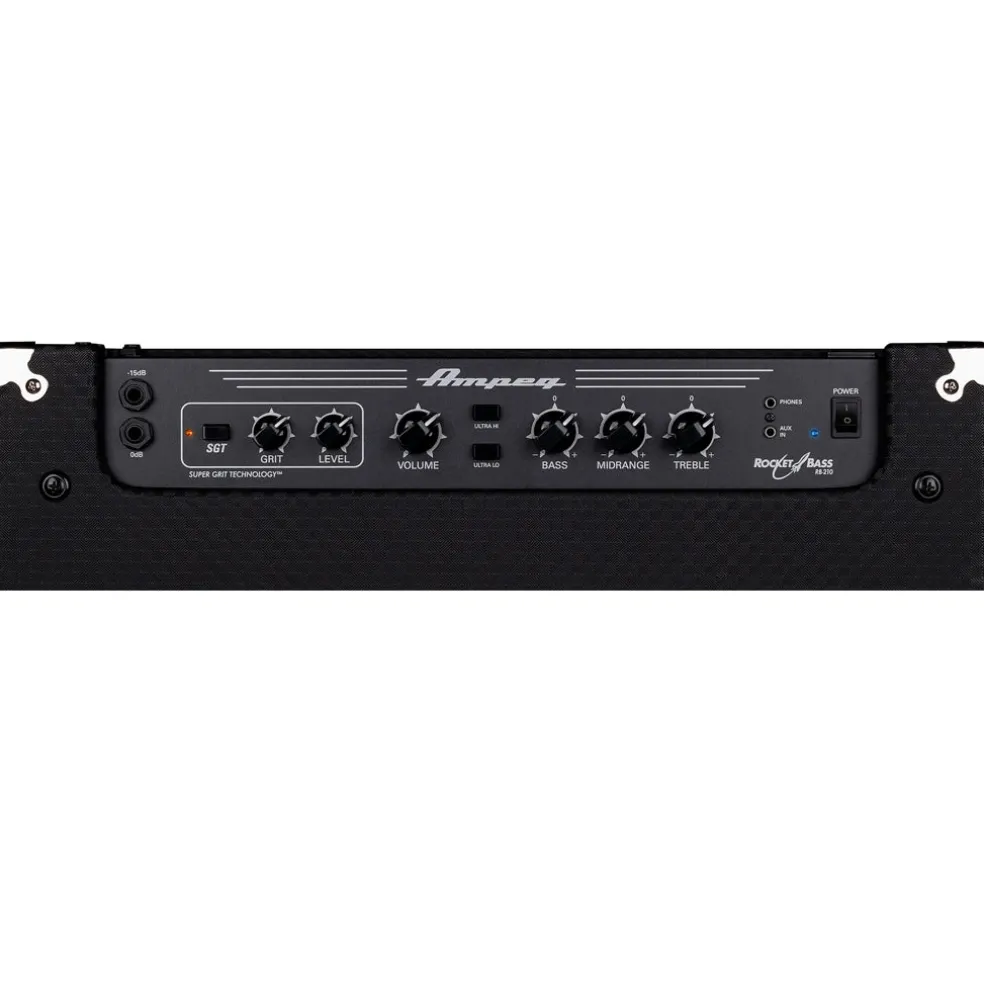 The 500-watt RB-210 is the ideal portable gigging amp. Dual custom 10 Eminence® speakers coupled with a mutable high-frequency horn reproduce a wide range of bass sounds, while classic Ampeg 3-band EQ, Ultra Hi/Ultra Lo switches, and the new Super Grit Technology™ overdrive circuit enable you to dial in your ideal tone. An effects loop, an auxiliary input, a headphone output, an extension speaker output, and an XLR direct output for connecting to a P.A. or recorder complete the package.