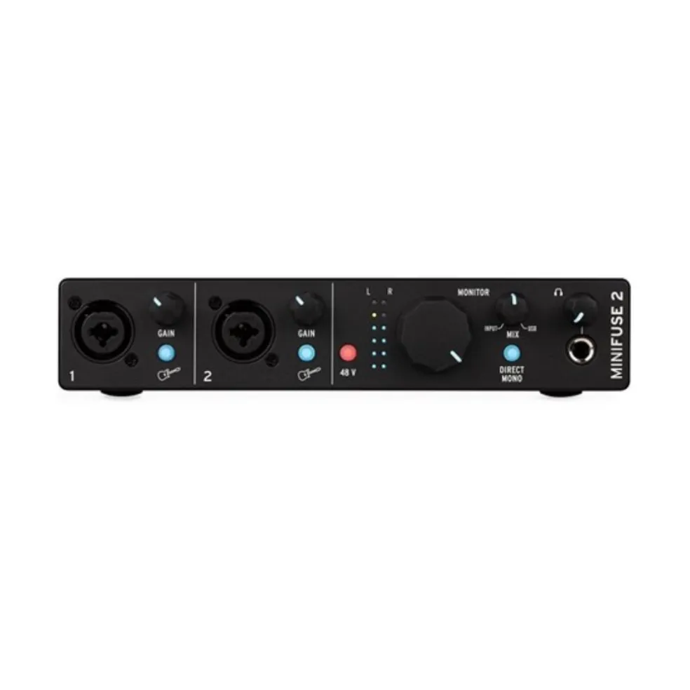 The MiniFuse 2, part of Arturia’s award-winning AudioFuse interface range, is an ultra-compact USB audio interface designed for home studios and mobile recording rigs. The MiniFuse 2 has two high-quality preamps and supports sample rates of up to 192kHz. This simple interface features a front-panel headphone jack with independent volume control and an input/USB mix knob for zero-latency monitoring. Electronic artists appreciate the availability of traditional 5-pin MIDI DIN I/O connections for connecting vintage synths and drum machines. You will also find a handy USB-A hub port for less studio clutter, which supports any USB-A device, including MIDI, with a maximum current of 250 milliamps. Content makers will be thrilled with the MiniFuse 2’s virtual stereo loopback channel, which allows you to hear and record your computer’s audio while also using the interface’s two analog inputs. The MiniFuse 2 also comes with a software package that includes some of Arturia’s most popular plug-ins, so you can start producing right away!