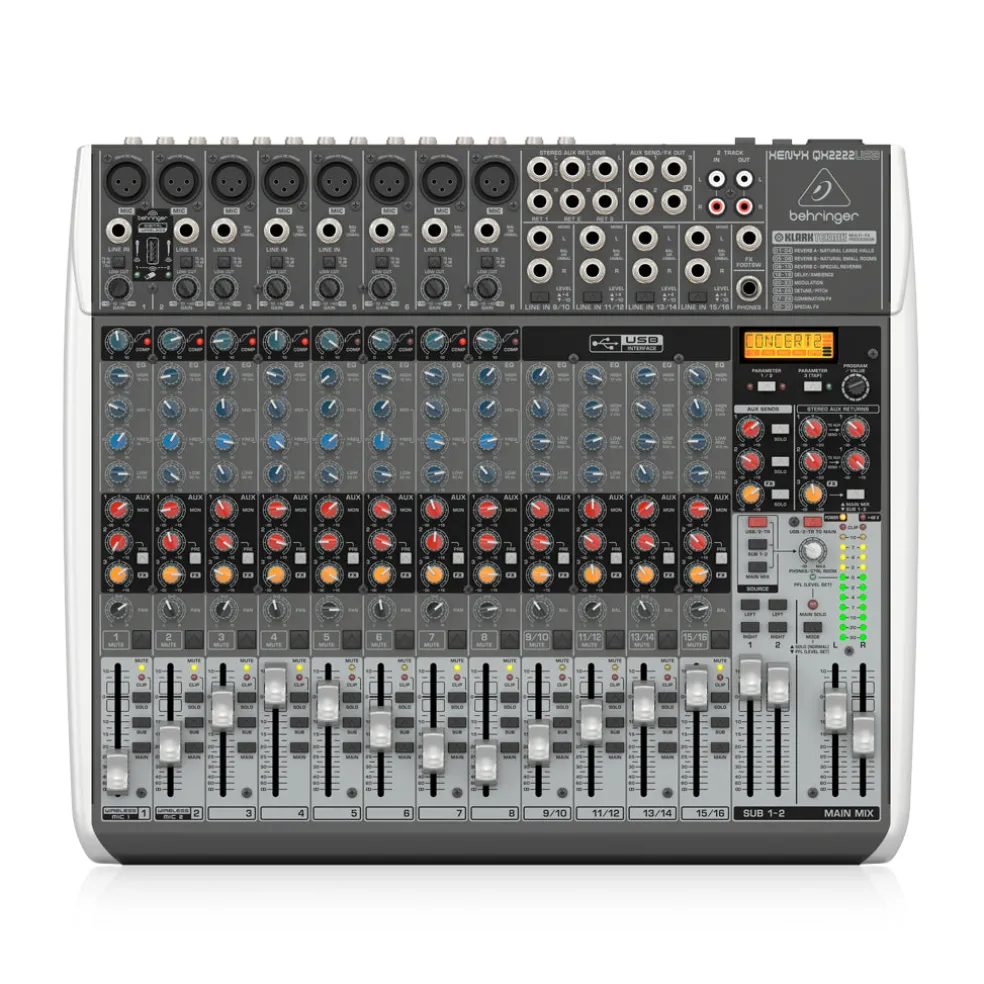 The feature-packed XENYX QX2222USB mixer allows you to effortlessly achieve premium-quality sound thanks to its 8 onboard studio- grade XENYX Mic Preamps and ultra- musical British channel EQs – with a semi-parametric mid band for warm and musical sound. And our easy-to-use one-knob compressors provide total dynamic control for the ultimate in punch and clarity, while respecting all the power and emotion you pack into every note. Add to this our KLARK TEKNIK FX processor with 32 studio-grade presets with dual addressable parameters, Tap function and storable user parameter settings – and the QX2222USB becomes an incredibly versatile mixer for your live performances.