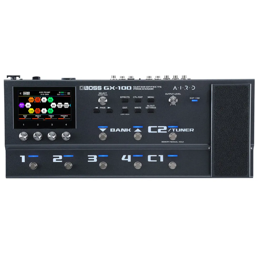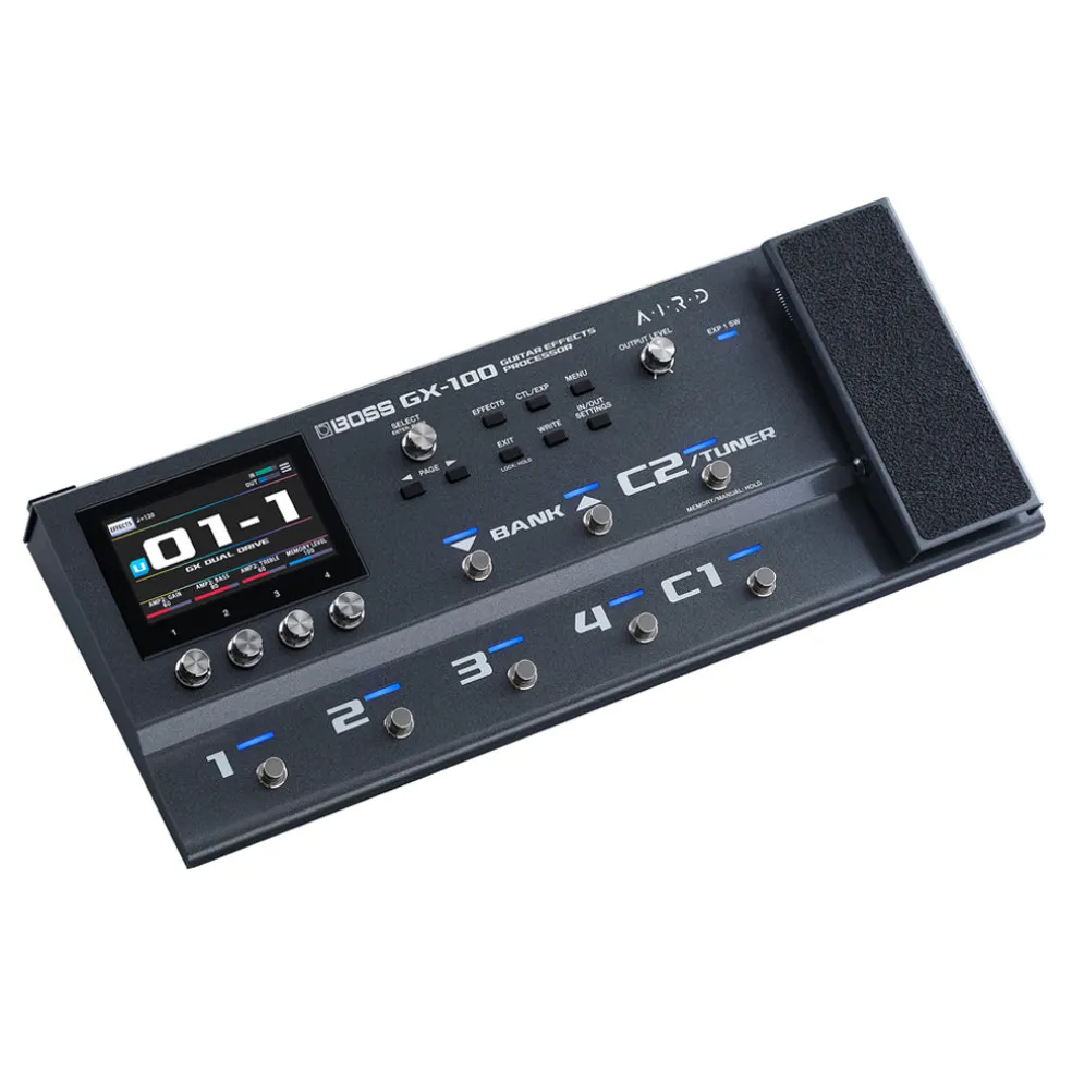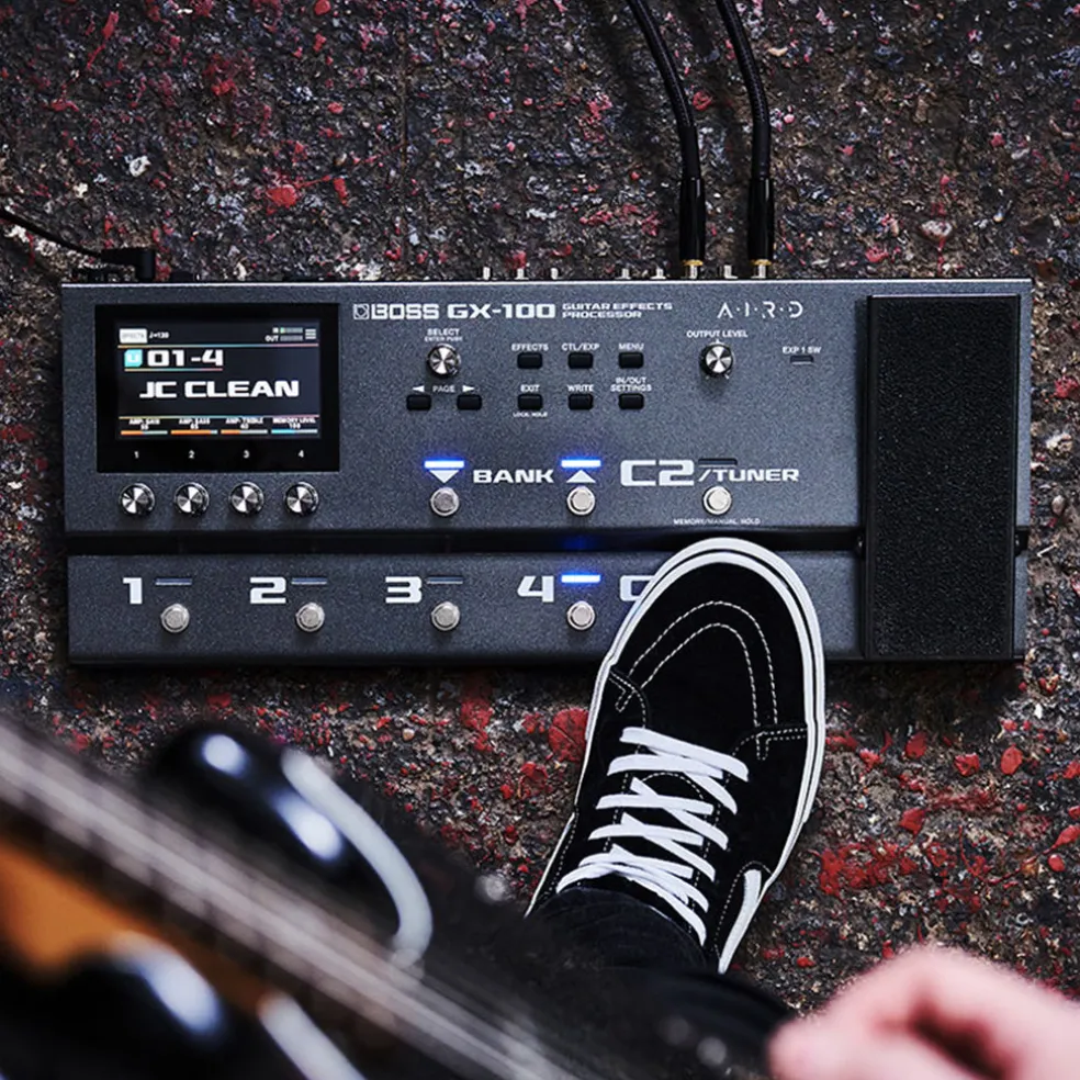 Fusing advanced BOSS tone technologies into a sleek, ultra-modern hardware design, the inspiring GX-100 delivers top-level performance everywhere you play. Explore 23 AIRD amplifiers and over 150 effects derived from the flagship GT-1000, and craft great sounds in seconds with the intuitive color touch display. Up to 15 simultaneous effect blocks provide unlimited tone possibilities, coupled with deep real-time command via onboard footswitches, an expression pedal, and external control support.