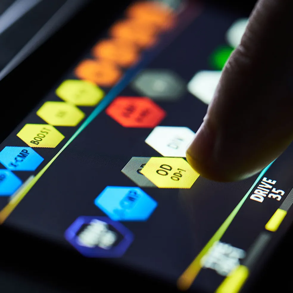 Sound creation and on-the-gig editing are simpler than ever with the GX-100. The vivid color touch display offers intuitive control of patch and effects selection, parameter tweaks, signal chain adjustments, and much more. The display works in harmony with the four knobs and page buttons on the panel, providing a frustration-free experience that keeps your attention focused on the music.