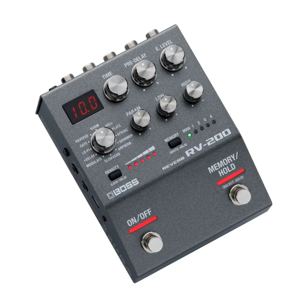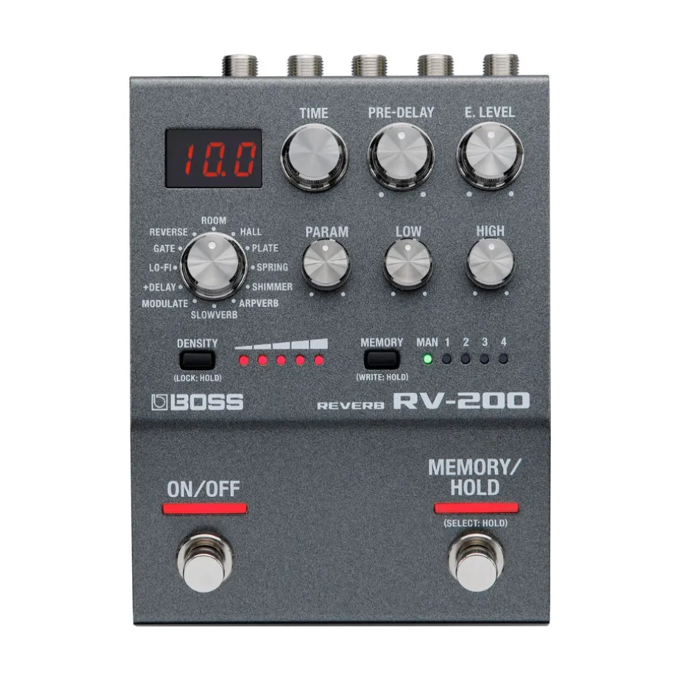 The RV-200 delivers inspiring reverbs and premium sound in the streamlined BOSS 200 series design. Twelve versatile reverb types including the newly developed Arpverb, provides everything from subtle spatial color to complex, dreamy textures for ambient explorations. Quickly dial in sounds with the fast-access interface. Save favorites in 127 memories, and take performances to the next level with flexible onboard foot switches, deep external control support, and head-turning creative tools like Warp, Twist, and more.