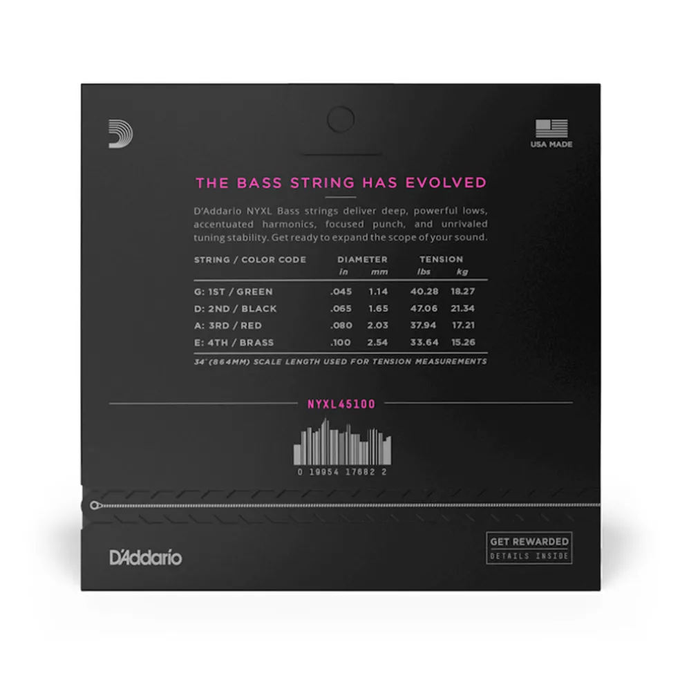 NYXL45100 is a regular light gauge string set for long scale basses. The high carbon steel used in NYXL strings offers higher break strength, enhanced tuning stability, and accentuated mid-range frequency response.