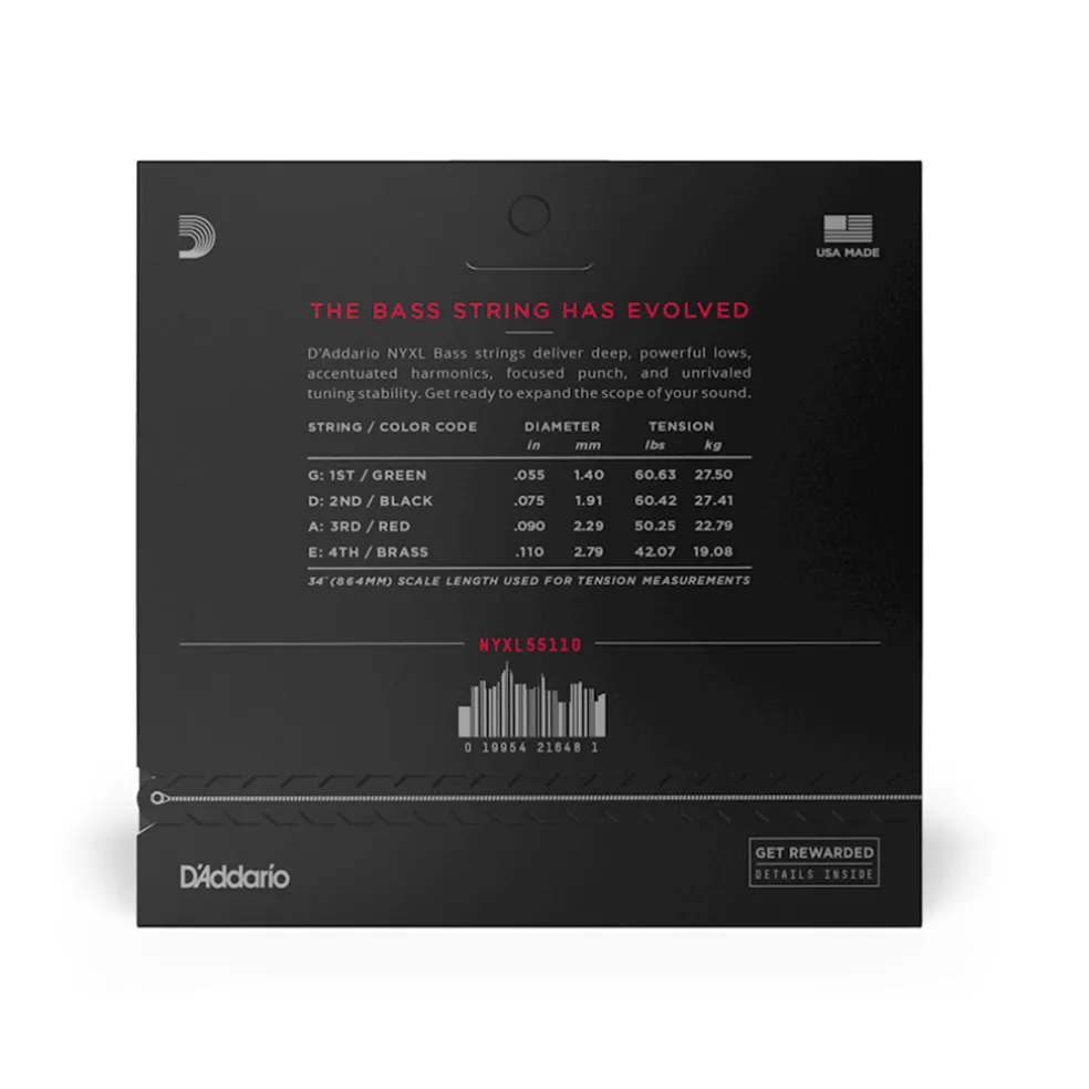 NYXL55110 is a heavy gauge string set for long scale basses. The high carbon steel used in NYXL strings offers higher break strength, enhanced tuning stability, and accentuated mid-range