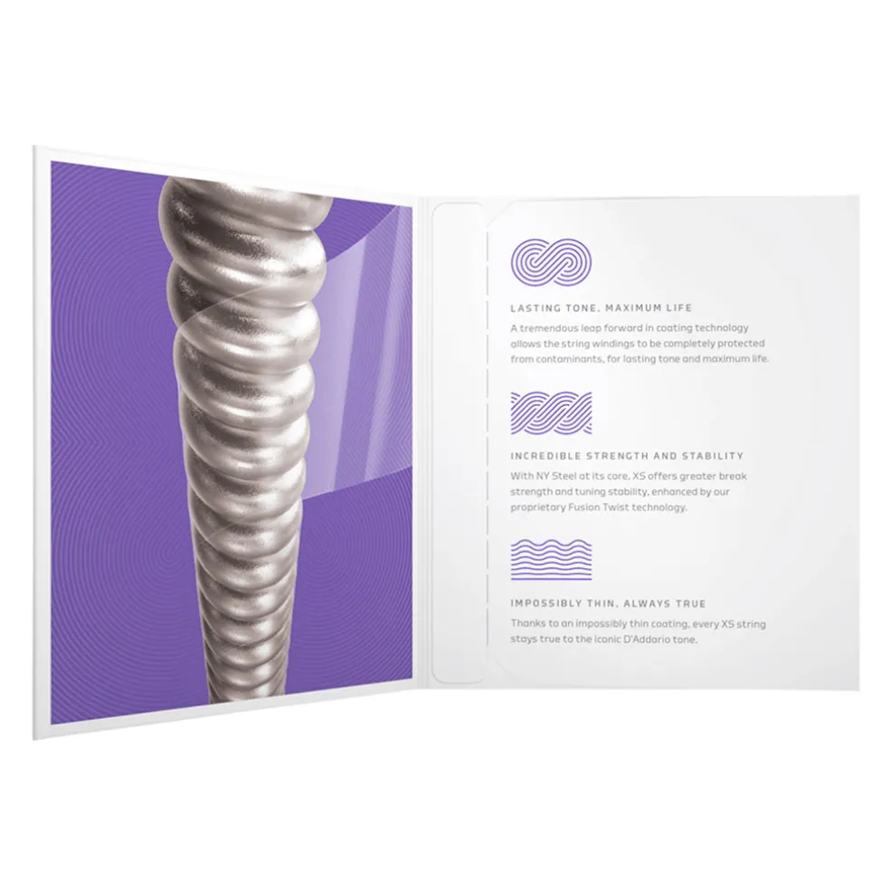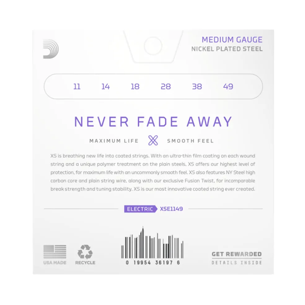 XS Nickel coated electric guitar strings provide the longest life of any D’Addario electric guitar string. Coated with our groundbreaking XS coating, these premium electric strings attain maximum life and a smooth, fast feel without dampening their outstanding tone. Constructed with a NY Steel core, reformulated nickel-plated steel wrap wire, and Fusion Twist technology, XS Nickel strings boast superior strength and tuning stability, plus richer harmonics, greater clarity, and remarkable definition with every sweep, slide, and bend. This 11-49 Medium gauge set provides increased volume, with slightly more tension and resistance.