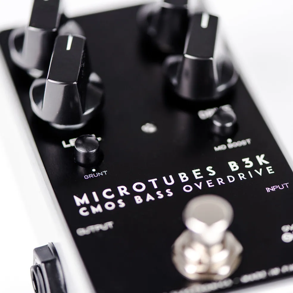 With the Microtubes B3K v2 you get all the features of the original, with the ability to restore the mids for natural character. The attack switch has been replaced by the tone knob, giving much more control of the higher harmonic content (3 kHz to 8 kHz). The grunt switch is still present, as you would expect. The addition comes in the form of a mid boost, giving you a subtle 6dB boost from 300 Hz to 1 kHz to help you cut through a bit more. Fundamentally the Microtubes B3K is the same pedal we designed nearly a decade ago, aimed to give you a perfect combination of brutality and clarity. You can guarantee that this pedal will deliver defined and powerful saturation in an intuitive format.