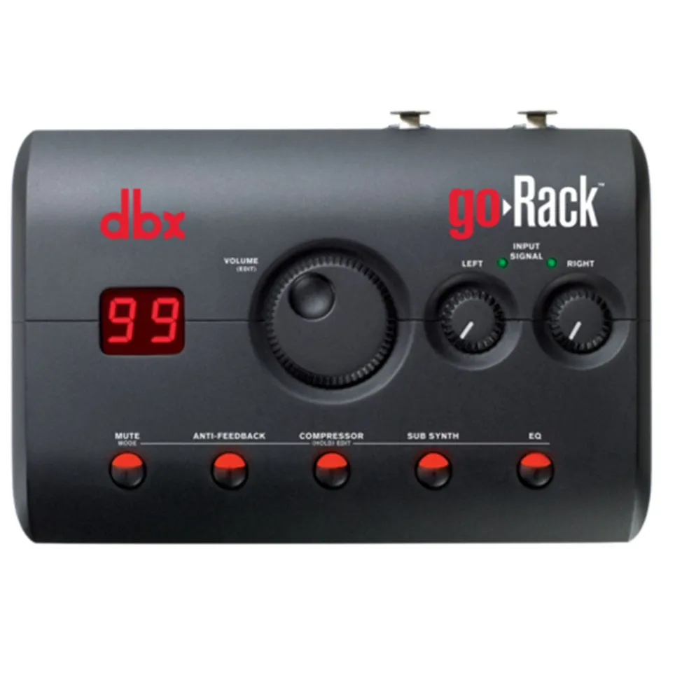 Historically, the convenience of portability in a PA System has meant a compromise in sound quality and fidelity. To answer that call, dbx is proud to introduce the all-new goRack™ Portable Performance Processor. The goRack is an easy-to-use portable speaker processor. Based on our industry-leading DriveRack® Series, the goRack sits next to a set of powered speakers and provides powerful signal processing including Anti-Feedback (based on our AFS™ Advanced Feedback Suppression algorithm), Compression, Sub-Harmonic Synth and EQ. Each processing function is easily enabled or disabled via the dedicated function buttons, and settings are adjusted via goRack’s large data wheel.