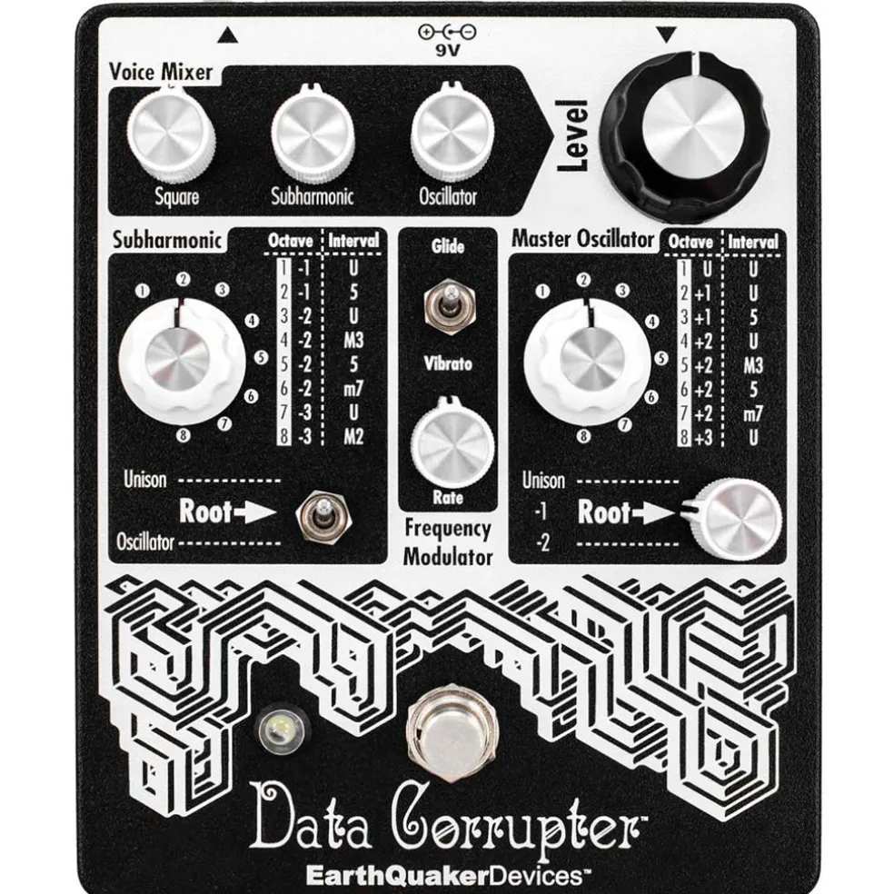 The Data Corrupter is a monophonic analog harmonizing PLL with modulation. It takes your input signal and brutally amplifies it into a crushing square wave fuzz tone that is then multiplied, divided and modulated to create a wild, yet repeatable, three-voice guitar synthesizer.