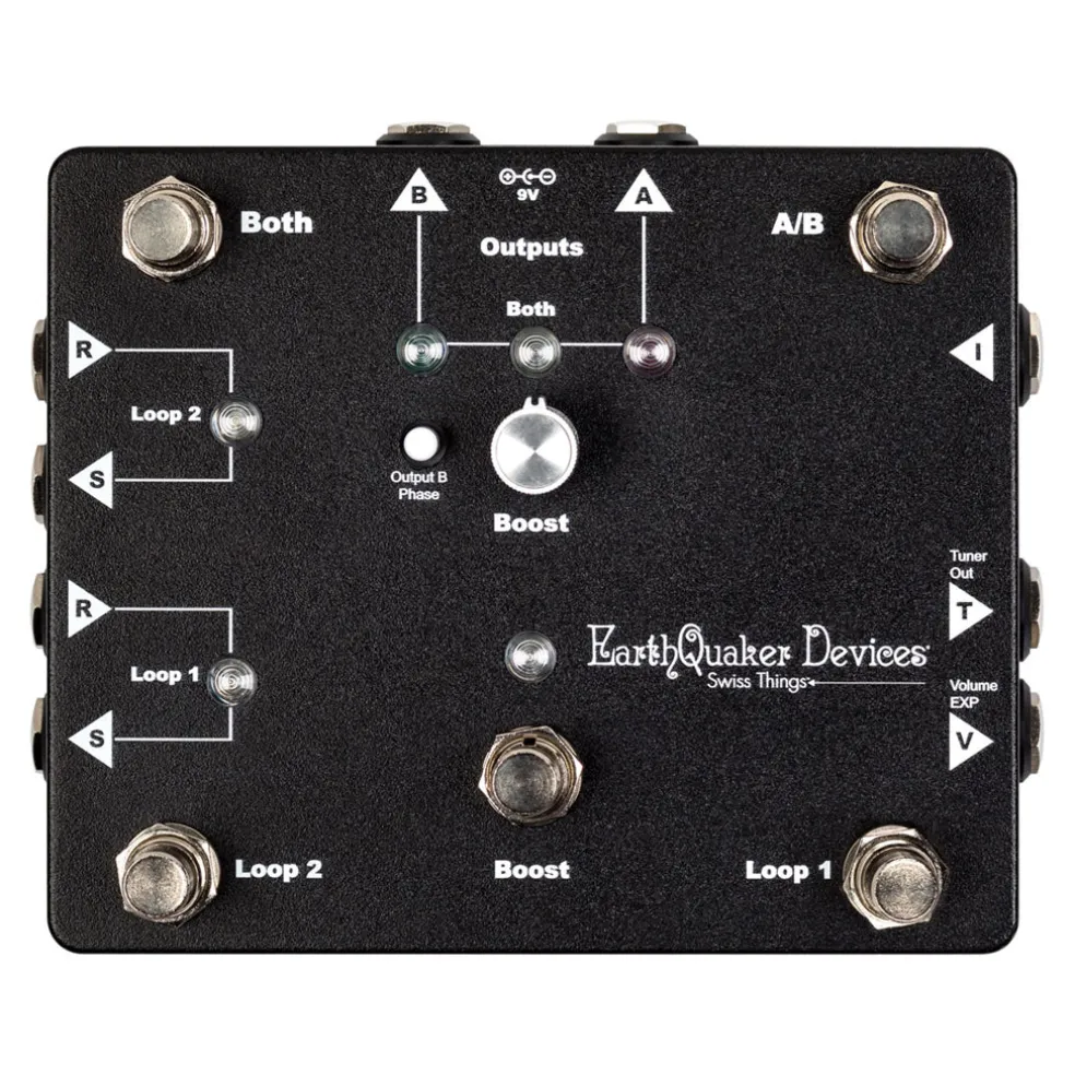 Swiss Things® combines two true-bypass Flexi-Switch® enabled effects loops, a Flexi-Switch® AB-Y box with transformer isolation between outputs, a buffered tuner output, 20dB of clean boost with adjustable gain, an expression pedal output for volume control and a quiet, high headroom output buffer into a compact pedalboard-friendly signal routing junction box that lives at the top-right corner of your pedalboard and really ties your rig together without any signal loss.