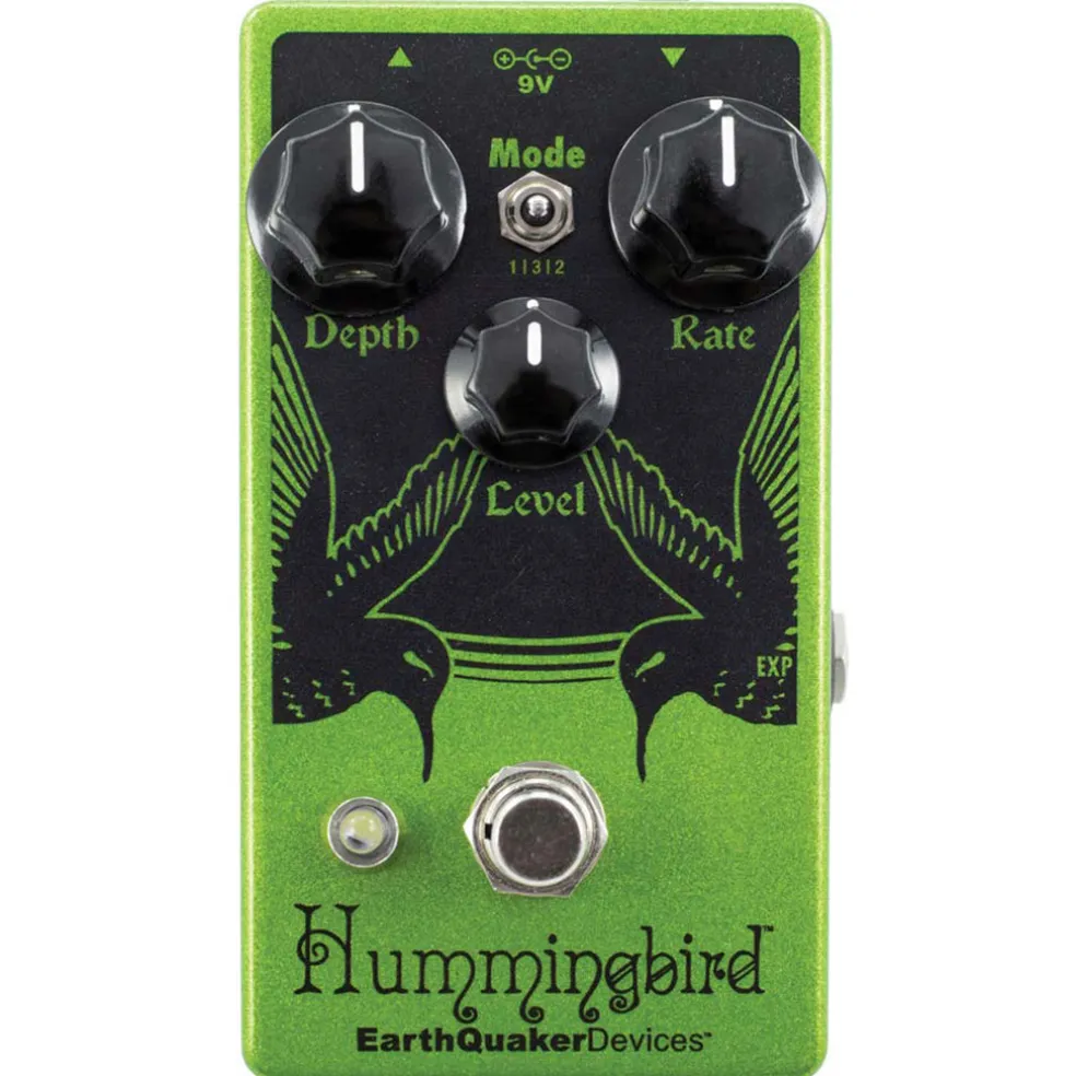 The Hummingbird is a choppy, sawtooth tremolo modeled on the vintage “repeat percussion” unit and similar to those found in old Valco and Vox amplifiers. It is capable of producing everything from classic “50’s style” shimmering tremolo to a synthy, delay-like chop that turns your signal into a burst of short pings and on through to near ring modulation speeds. Simply choosing between modes 1 (slow), 2 (mid-tempo) or 3 (fast) and adjusting the rate and depth controls will unlock a whole new world of amplitude modulation at your feet. The Rate is also expression pedal accessible to allow instant changes on the fly. Using an expression pedal opens up the possibility of true random amplitude modulation! In addition to the modulation, the Hummingbird has plenty of clean gain on-tap allowing you to either boost or cut the signal using the level control. If the Depth is turned to zero, the Hummingbird will become a JFET clean boost!