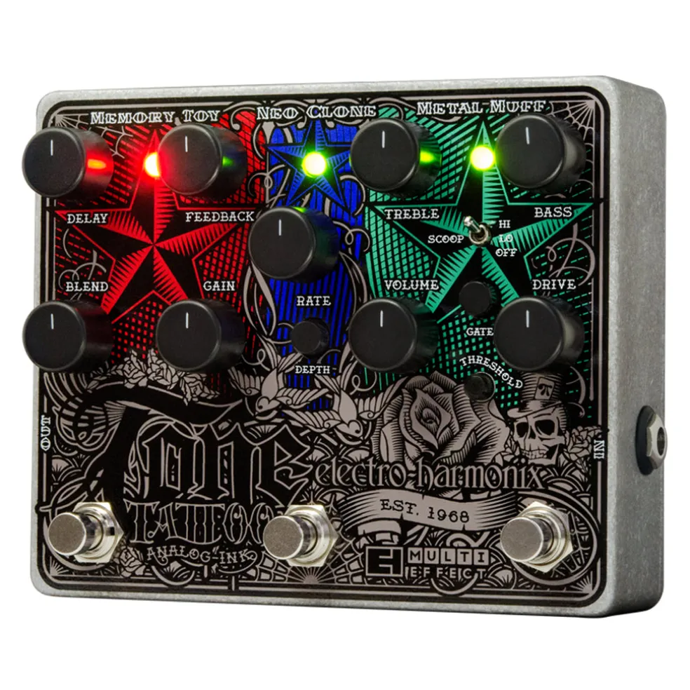 TONE TATTOO is a fully-interactive, analog multi-effects pedal. Satisfy your tone jones with a chain that features the Metal Muff Distortion, Neo Clone Chorus and Memory Toy Analog Delay.