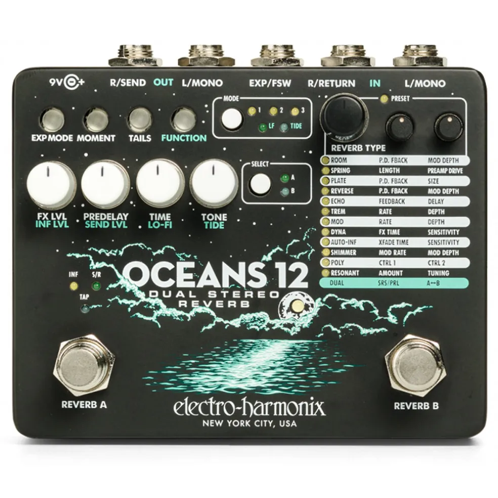 The Oceans 11’s big brother with even more reverbs and functionality. It features two simultaneous, independent, stereo reverb engines, series and parallel control for the dual reverbs, 24 presets and advanced I/O allowing for stereo in/out or mono send/return with pre and post reverb options. The pedal also includes a new Tide Control for stereo image alteration, a Lo-fi Control, an infinite attenuation control and an input jack for external expression and 3-button footswitch control.