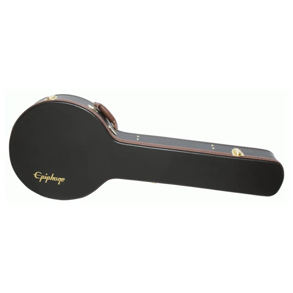 Epiphone 5 String Banjo Hard Case. Epiphone Hard Cases are the best way to protect your instrument while traveling! On the outside, the smooth simulated leather vinyl exterior has the classic Epiphone logo. Inside, the plush interior has plenty of padding along with a handy pocket for your picks and guitar strap. Featuring a premium padded handle and heavy duty latches.