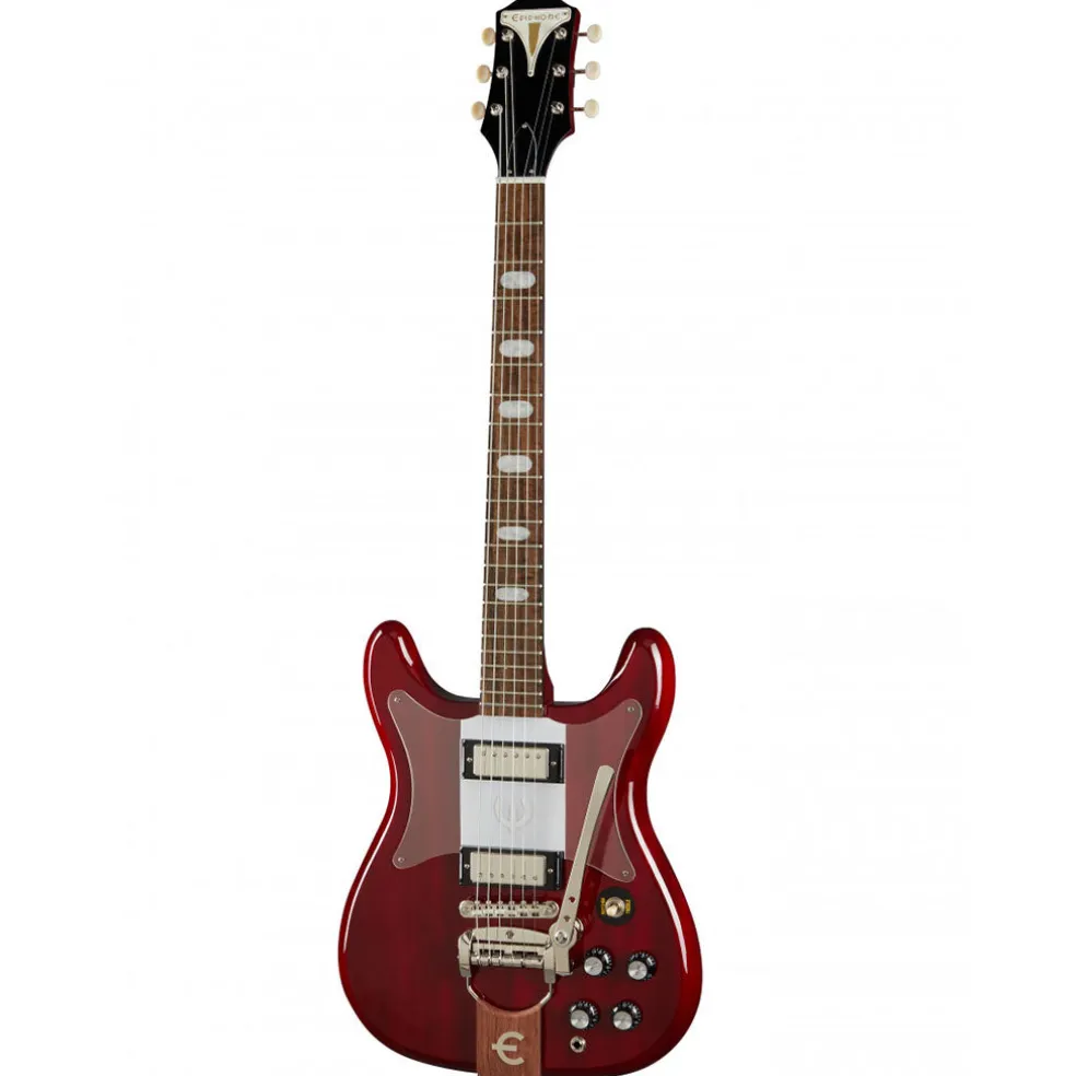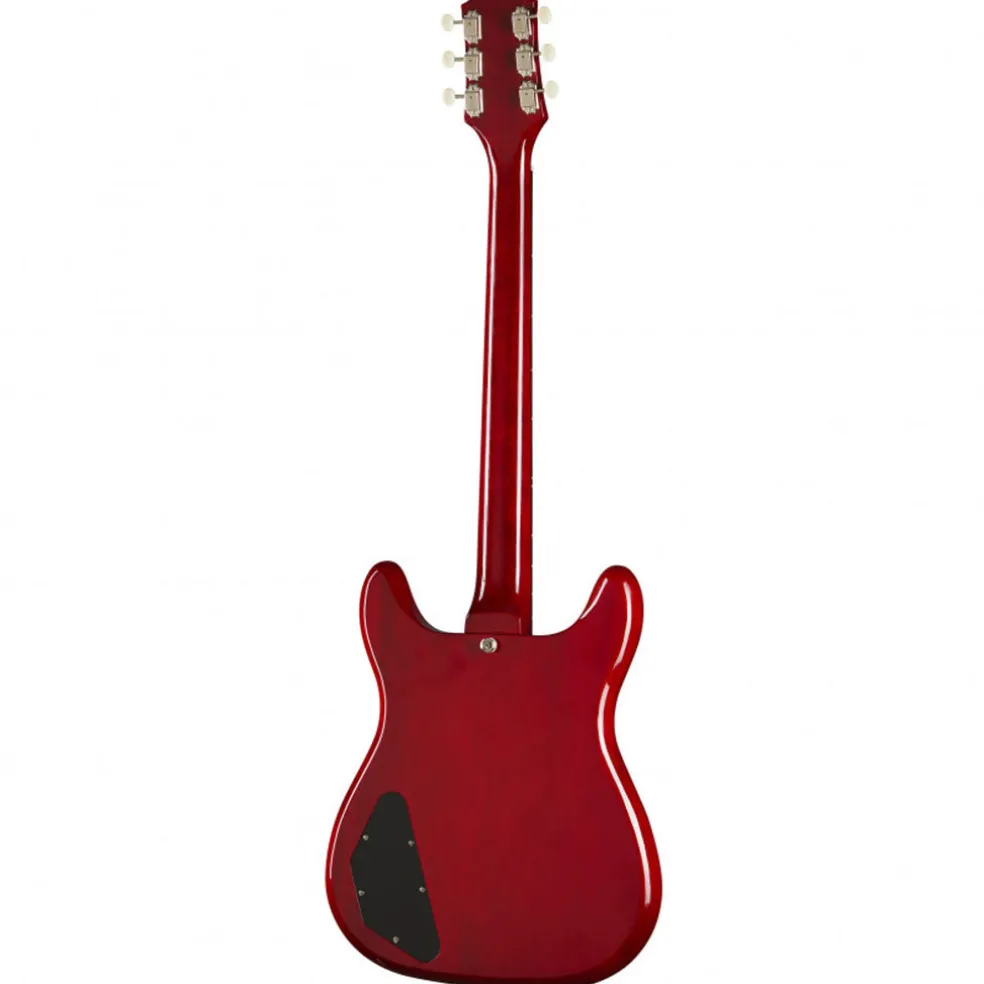The Crestwood first appeared in 1958 and it was renamed Crestwood Custom in 1959; it was Epiphones first two-pickup solid-body electric guitar design. The new Epiphone Crestwood Custom returns to its roots with features that harken back to the early models including a symmetrical double cutaway mahogany body with two Epiphone PRO Mini Humbucker™ pickups, three on a side reduced sized Kalamazoo headstock with Epiphone Bikini badge and ivory button Epiphone Deluxe tuning machines, and a clear butterfly pickguard with white center stripe and foil E logo. The Crestwood Custom comes equipped with a glued-in mahogany neck with a medium C profile, Indian laurel fretboard with 12 radius, 22 medium jumbo frets and Epiphone oval inlays, 2 volume and 2 tone controls with CTS® potentiometers and an Epiphone LockTone™ Tune-O-Matic™ bridge with Graph Tech® TUSQ® saddles and Tremtone vibrato tailpiece.