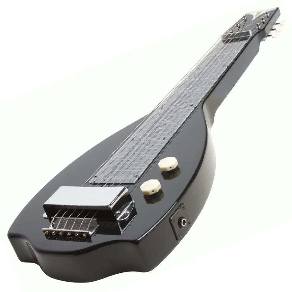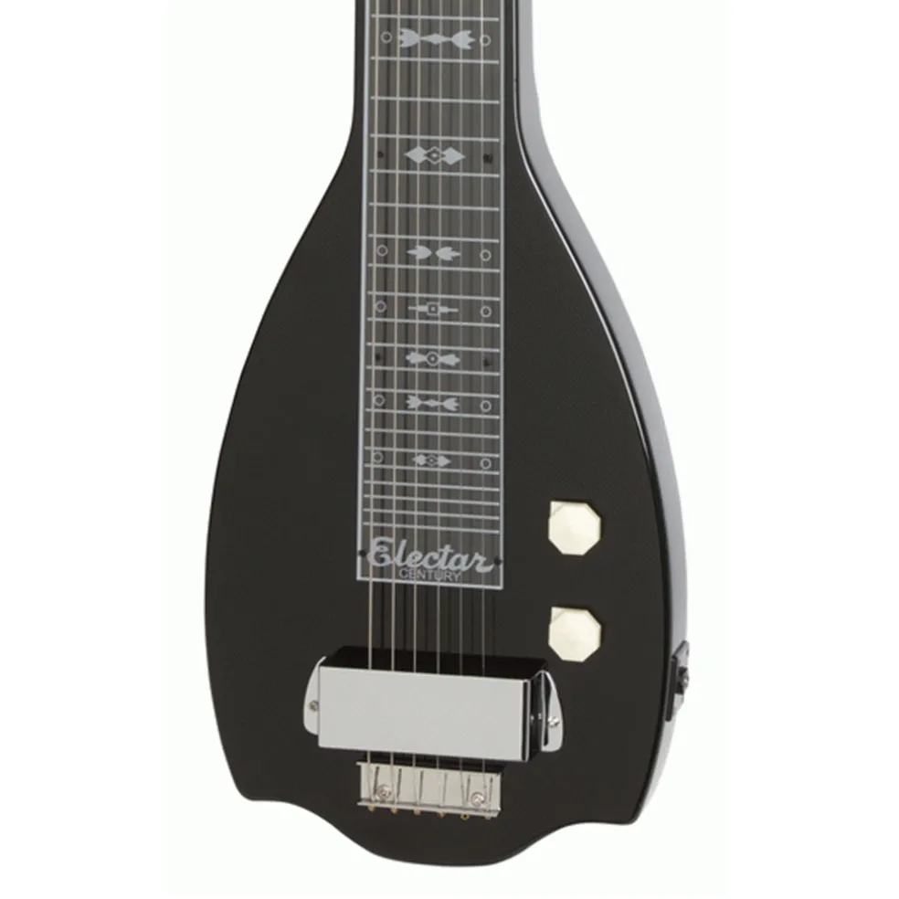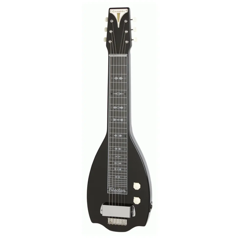 The new Epiphone Electar Inspired by 1939 Century Lap Steel 6-string Outfit features the same body profile as the vintage original with a one-piece Mahogany body and neck with an Ebony finish. The back of the body has an inset non-slip rubber pad.The 1939 Century neck area has a classic Plexiglass fingerboard with a traditional 1939 Art Deco Replica inlay design with 28 frets that are properly set for great intonation at any position. The headstock features the vintage metal Epiphone badge used on Epiphone’s earliest electric archtops from the 40s through the introduction of the Epiphone Casino in 1961! The 2.5 aluminum nut is raised slide and the Wilkinsonâ„¢ Deluxe 3-in-Line machine heads have Ivory Colored Buttons.