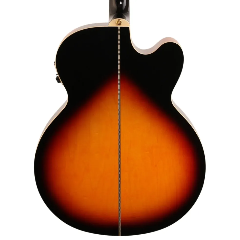 The J-200 EC pays homage to the King of the Flattops – the classic Gibson SJ-200. This Inspired by Gibson Epiphone features a cutaway Super Jumbo body with select maple back and sides, solid spruce top for outstanding tone, a smooth-playing hard maple neck with a SlimTape D profile, pau ferro fretboard, 20 medium jumbo frets, and classy pearloid crown inlays. The bridge has the legendary Moustache shape and the pickguard features iconic J-200 graphics. Comes equipped with a Fishman Sonicor under-saddle pickup and Presys preamp with built-in tuner. A battery is not included. To power your pickup, you will need a 9-volt battery. (Previously called Epiphone EJ-200SCE Acoustic/Electric)