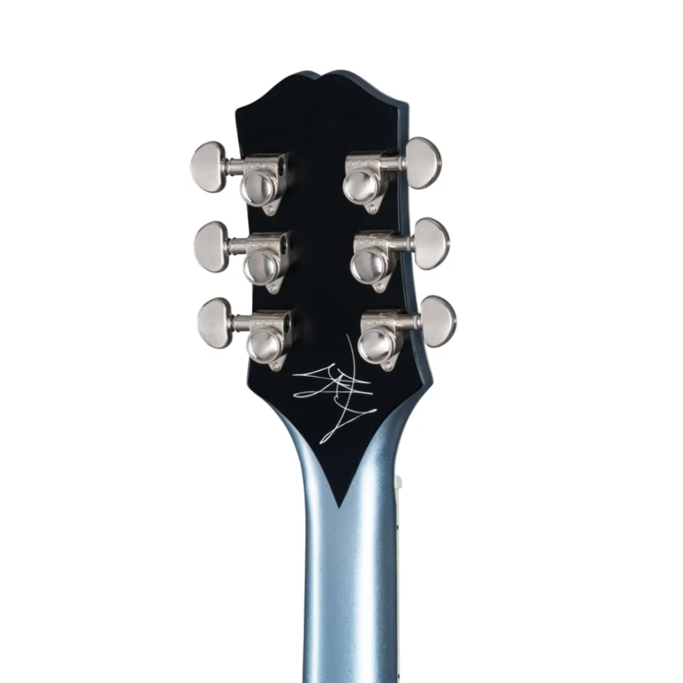The Jared James Nichols Blues Power Les Paul Custom is the latest signature model from the Gibson Brand Ambassador and blues-rock powerhouse that hails from Les Paul’s hometown. The Jared James Nichols Blues Power Les Paul Custom features classic Les Paul Custom styling and cosmetic appointments and a stunning Aged Pelham Blue finish. It pairs that with brushed nickel hardware, including Grover® Locking Rotomatic® tuners and a wraparound Lightning Bar bridge for rock-solid tuning stability. A single Seymour Duncan® Jared James Nichols Signature JJN P90 Silencerâ„¢ in the bridge position ensures righteous tone and hum-free performance, and the included EpiLite case helps keep your investment safe and secure.