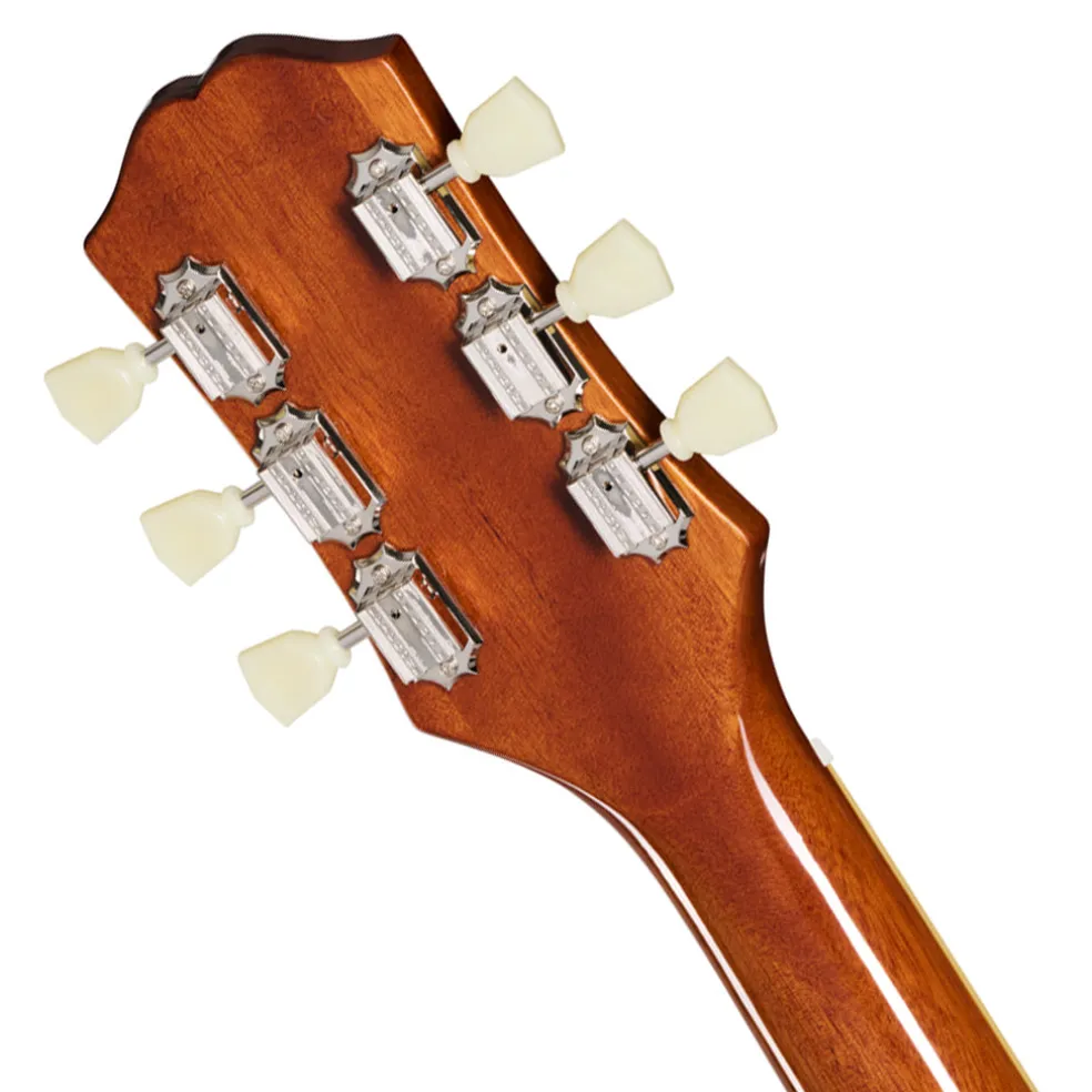 This guitar is crafted with a mahogany body with a maple cap, a bound ’59 Rounded Medium C-shaped mahogany neck with long neck tenon, laurel fretboard with classic trapezoid inlays and 22 medium jumbo frets, Epiphone’s Vintage Deluxe tuners, a pair of critically acclaimed Epiphone Probucker™ humbuckers™, and gold Top Hat knobs with dial pointers. This Epiphone Inspired by Gibson Original model also has the Kalamazoo headstock, Graph Tech® nut, era-appropriate wiring, and CTS® pots. A premium gig bag is also included.