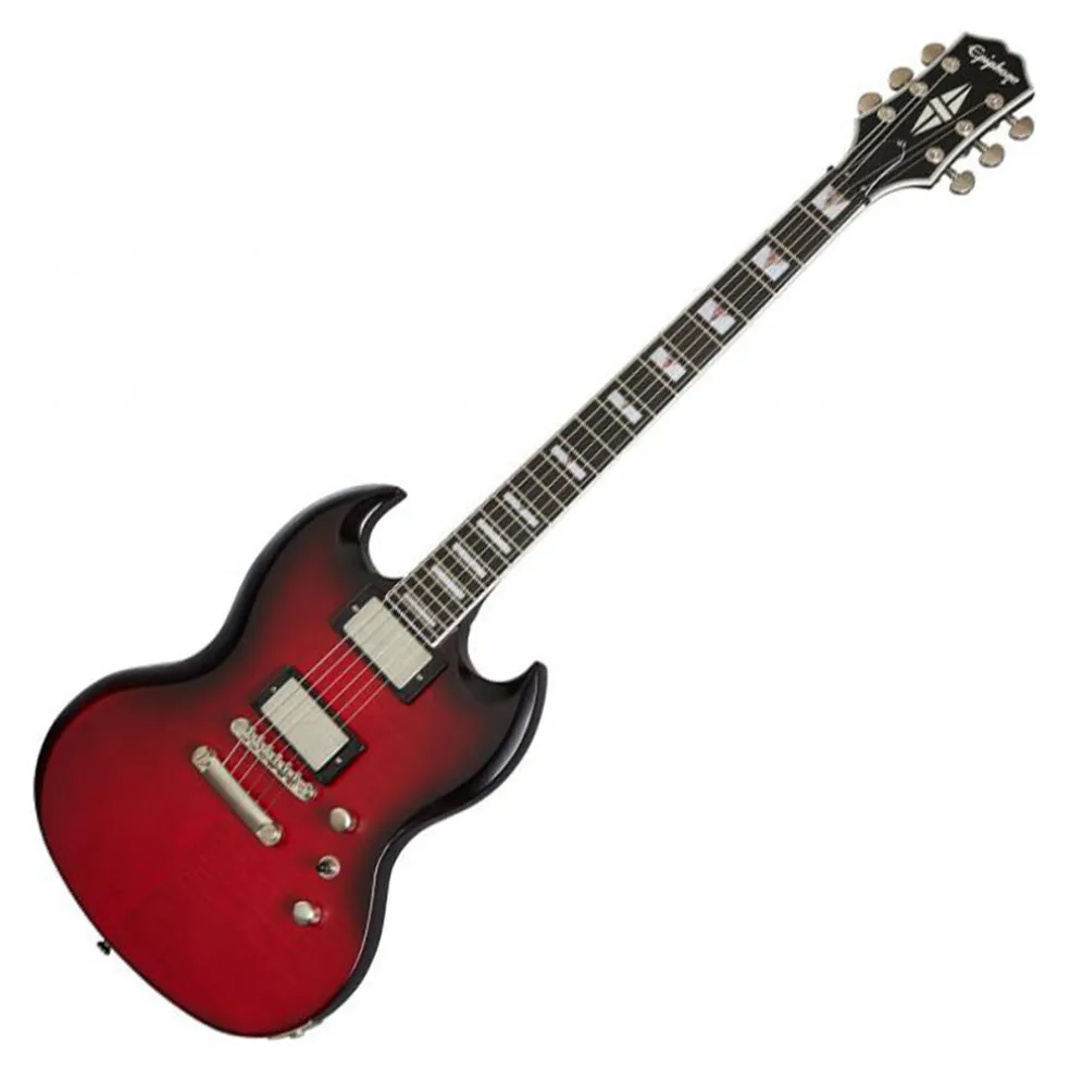 The Epiphone Prophecy SG brings high-performance features to the classic SG™ design, making it an excellent choice for todays progressive guitarists. The mahogany body is topped with a 1/2 maple cap and beautiful AAA flame maple veneer, along with a thinner Aged Vintage Gloss finish. The SlimTaper™ asymmetrical mahogany neck features a 24 fret ebony fingerboard with jumbo frets, Block and Triangle pearloid/abalone inlays with abalone selected to complement the body color, brushed nickel Grover® Locking Rotomatic® tuners, and a black Graph Tech® NuBone® nut.