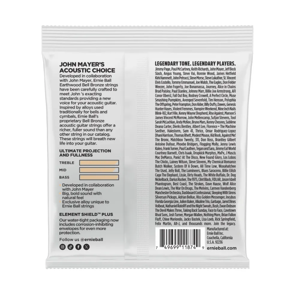 Developed in collaboration with John Mayer, Ernie Ball Earthwood Bell Bronze strings have been carefully crafted to meet John’s exacting standards providing a new voice for your acoustic guitar. Inspired by alloys used traditionally for bells and cymbals, Ernie Ball’s proprietary Bell Bronze acoustic guitar strings offer a richer, fuller sound than any other string in our catalog. These strings will breathe new life into your guitar!