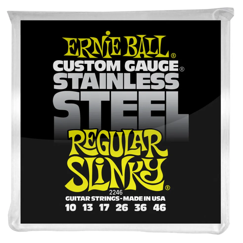 The Ernie Ball Regular Slinky Wound Electric Guitar Strings are made from stainless steel wire wrapped around tin plated, hex shaped, steel core wire. These strings provide a brighter tone and longer string life due to stainless steels inherent anti-corrosive properties.