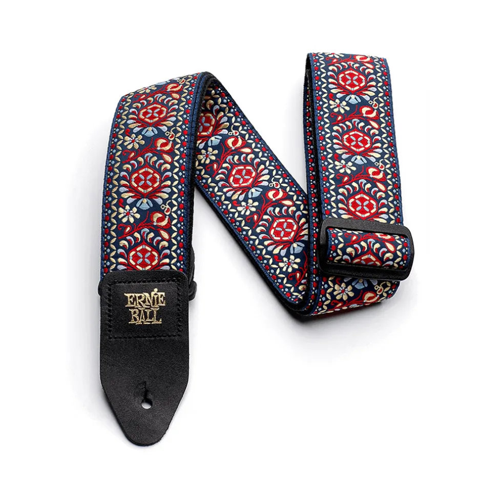 The Ernie Ball Royal Bloom Jacquard Guitar Strap featuring embroidered leather ends with durable yet comfortable polypropylene webbing. With royal bloom pattern. Adjustable length 41 inches to 72 inches.