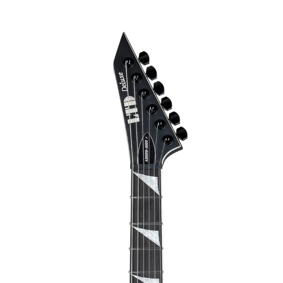 Guitars in the LTD 1000 Series are designed to offer the tone, feel, looks, and quality that working professional musicians need in an instrument. The Arrow-1000NT stands for “non-tremolo”, delivering this bold and angular guitar shape with a recessed TonePros TOM bridge and string-thru-body design. It offers a neck-thru-body design with mahogany body, 3-piece maple neck, reverse headstock, and Macassar ebony fingerboard with triangular white pearloid inlays. Designed to provide the tones for modern rock and metal, the Arrow-1000NT features a set of direct-mount Fishman Fluence Modern Humbucker active pickups (alnico in the neck and ceramic in the bridge), with push-pull control to select voicings. These pickups offer an outstanding variety of huge tones that range from aggressive and punchy to smooth and articulate. The Arrow-1000NT also includes stainless steel frets and precise LTD locking tuners.