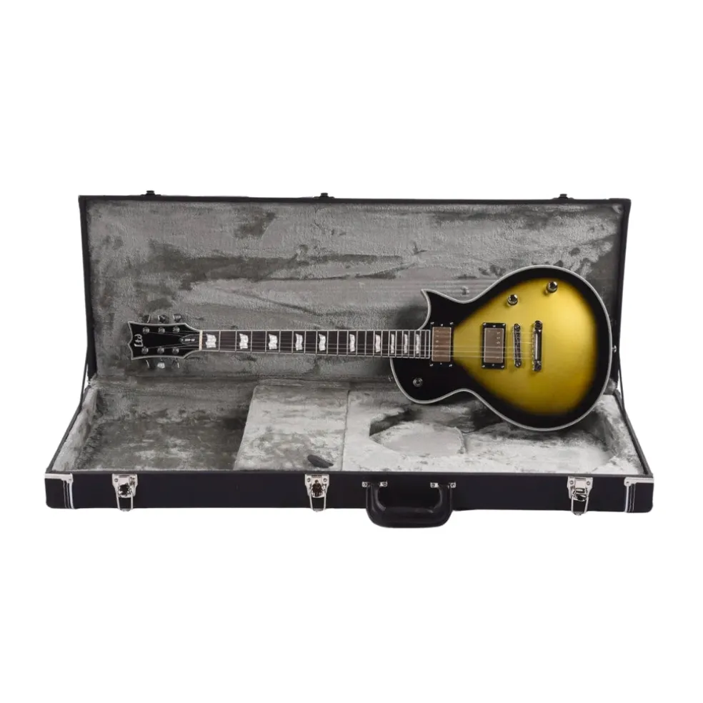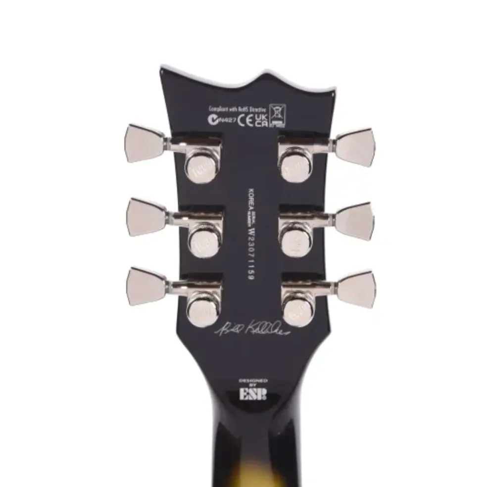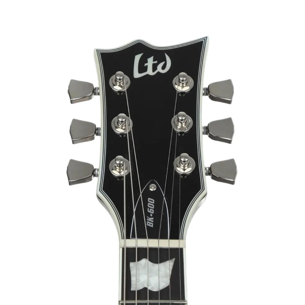 Bill Kelliher is the respected guitarist for award-winning American metal band Mastodon, and the newest version of his LTD Signature Series BK-600 is, in a word, spectacular. Based on the single-cutaway ESP Eclipse shape, the latest BK-600 stands out with its copper-tinged Vintage Silver Sunburst finish and multi-ply binding on the body and headstock. This guitar offers traditional full body thickness and no waist cut, and is designed to provide the wide range of tones needed for Mastodon’s music while being sturdy and reliable enough for his most punishing rhythms and brutal riffs throughout long tours. Another update on the BK-600 is the set of Bill’s signature Mojotone Hellbender humbucker pickups. Designed for the duality of brutality and beauty, these nickel-covered pickups offer everything from raw and menacing tones to complex, articulate, and open cleans. Both the bridge and neck pickups may be split with push-pull controls on the volume and tone knobs. The BK-600 offers set-thru construction at 24.75” scale for unencumbered access to the highest frets, with a mahogany body, a bound three-piece mahogany neck, and a Macassar ebony fingerboard with 22 extra-jumbo frets and pearloid ESP flag inlays. Other professional features on the LTD BK-600 include LTD locking tuners and a TonePros locking bridge and tailpiece, and an ESP deluxe hardshell case is included.