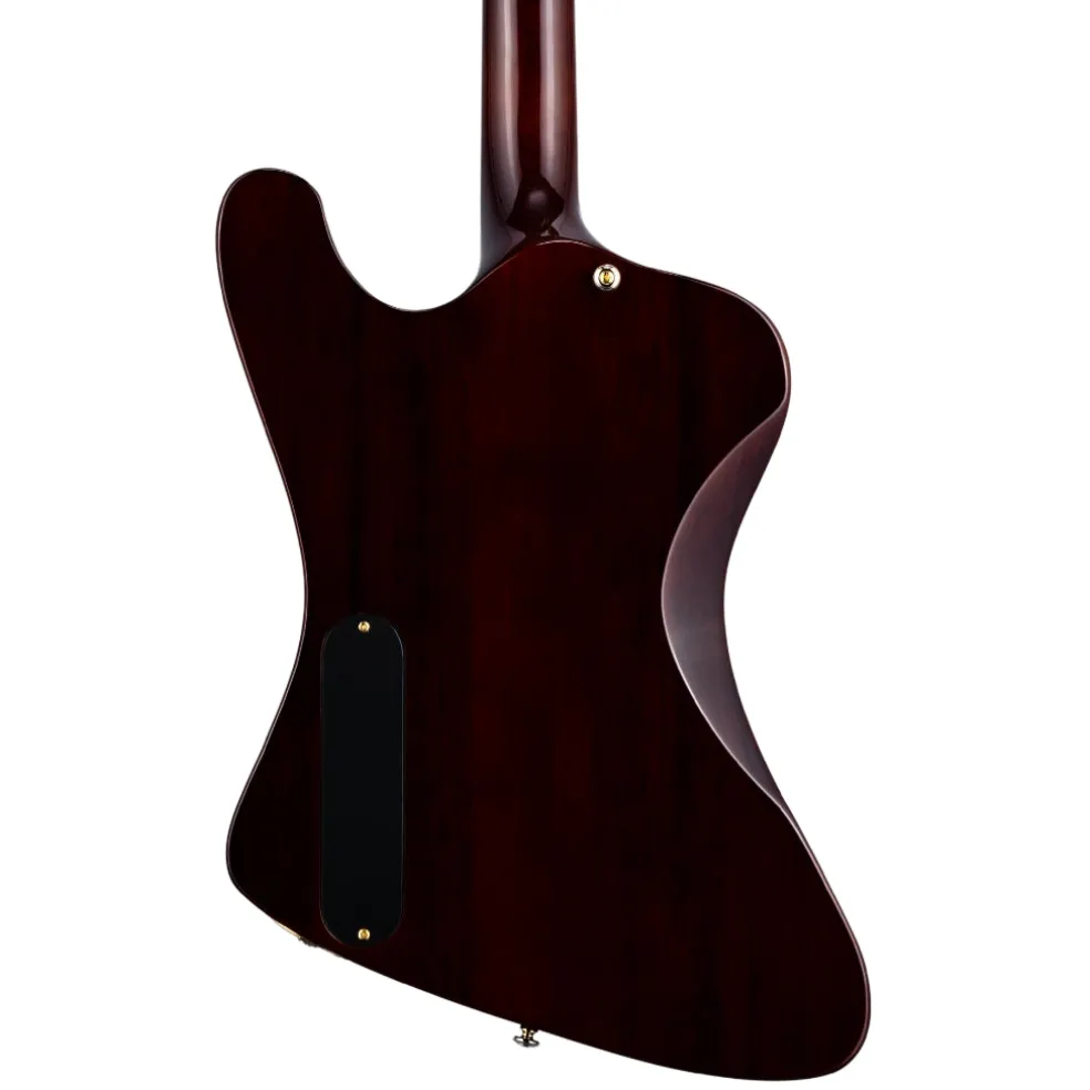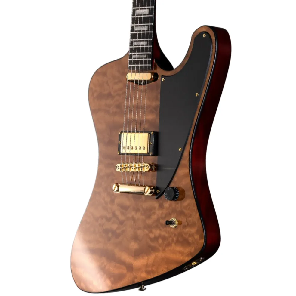 The Macassar ebony fingerboard includes 22 extra-jumbo stainless steel frets, offering durability and smooth playability across the entire fretboard. Additional design details include gold hardware, a brushed black pickguard, and a black bone nut, giving the guitar a refined, premium aesthetic.