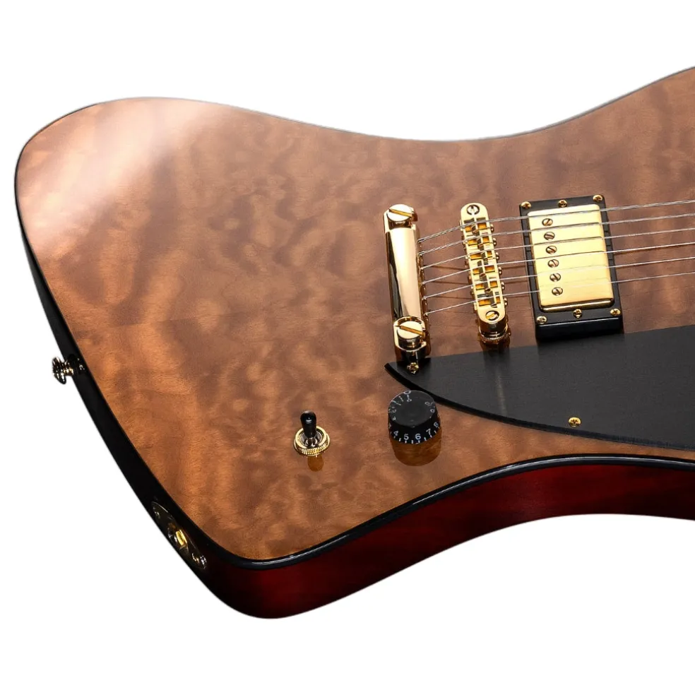 The CALEB SHOMO Signature Model LTD CS-II, in a stunning Vintage Natural finish with a quilted maple top, offers exceptional craftsmanship and style. Built with neck-thru-body construction at a 25.5” scale, it features mahogany body wings and a three-piece thin U-shaped mahogany neck, providing excellent sustain and playability.