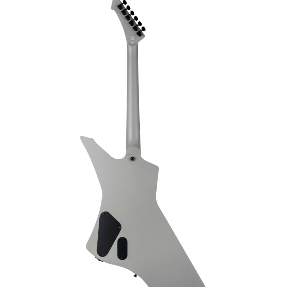 The James Hetfield LTD Signature Series Snakebyte features set-neck construction at 24.75′ scale with a mahogany body, a thin U-shaped three-piece mahogany neck, Macassar ebony fingerboard, 22 extra-jumbo frets, a TonePros locking TOM bridge and tailpiece, and James’ own EMG JH SET active pickups.