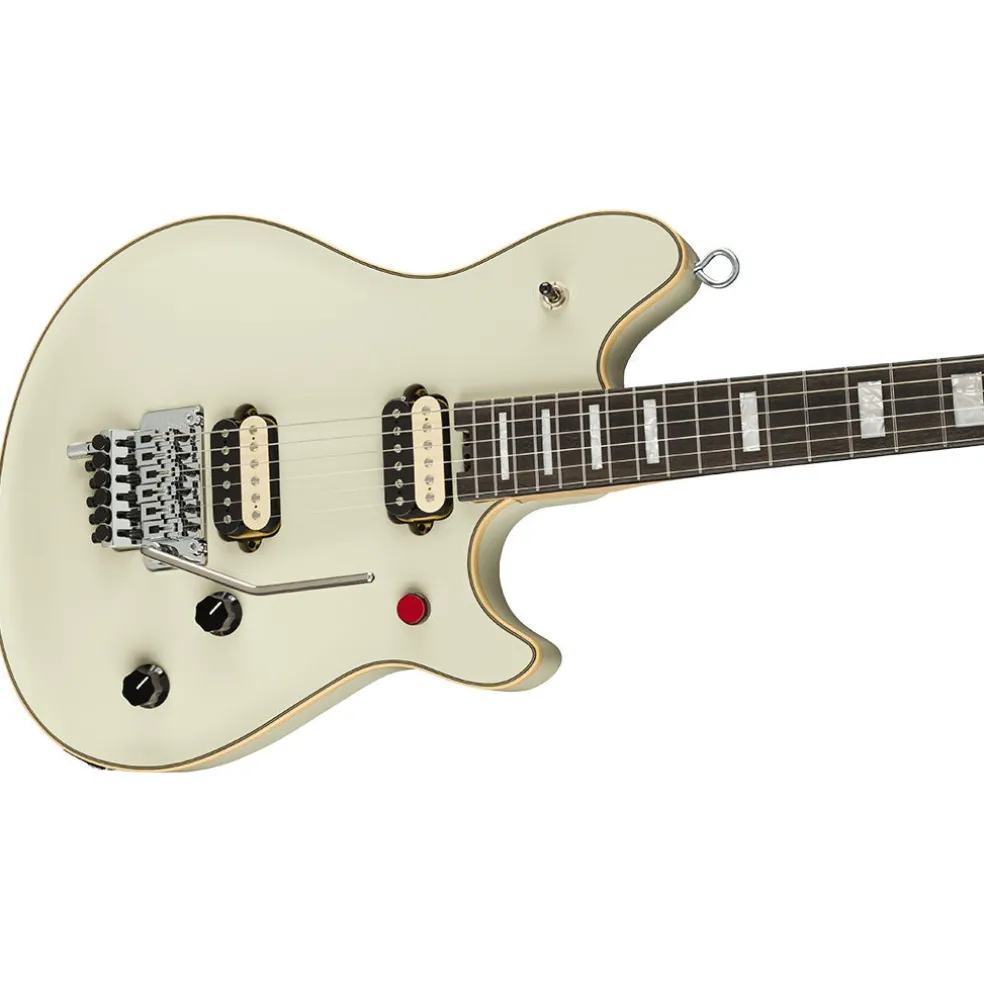 The all-new MIJ Series EVH Signature Wolfgang® is offered in Ivory or Stealth Black finishes, each with cream body binding, black knurled control knobs, chrome eye hook strap buttons and black headstocks. The Ivory finish features pearloid block inlays and chrome nut, retainer bar and tuners, while the Stealth finish features pearloid dot inlays, chrome nut, black retainer bar and black tuners.