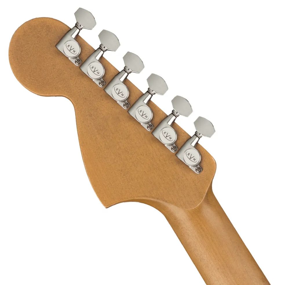 Other features include a skirted white Strat-style volume control knob (labeled “tone”) with 500K EVH Bourns® low friction pot and treble bleed circuit, black pickguard, chrome hardware, oversized strap buttons, EVH neck plate and larger, ‘70s-style licensed Fender Strat headstock with gold EVH logo.