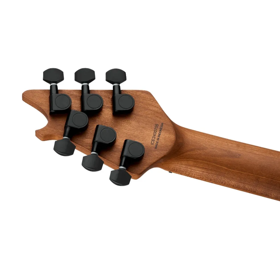 It features a flat-top basswood body with a sleek “comfort cut” forearm contour for ergonomic playing. The bolt-on caramelized maple neck is graphite-reinforced for incredible stability, topped with a fast, baked maple fingerboard that boasts a 12″-16″ compound radius and 22 jumbo frets for smooth shredding and effortless bends.