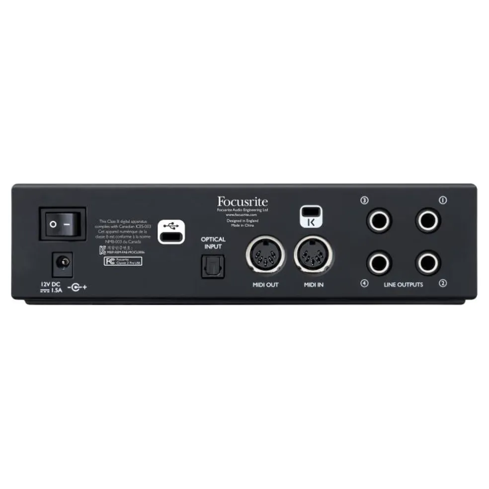2 x combi mic/line/instrument XLR inputs with 48V phantom power 1 x optical ADAT input for expanding by up to 8 extra inputs 1 x 5-pin MIDI input |