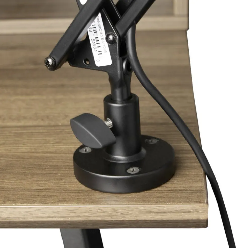 Desk-mounted broadcast/podcast boom mic stand.