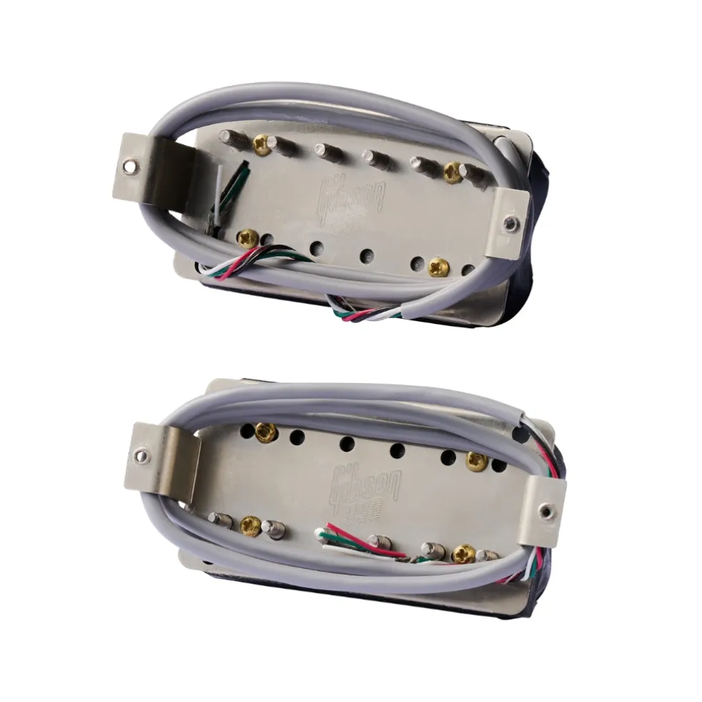 This pickup set combines the 496R and the 500T. Introduced in the early 1970s, Gibson’s 496R pickup filled the need for a more powerful humbucker and helped energize the emergence of hard rock and heavy metal. With its powerful ceramic magnet, the 496R delivers incredible sustain and cutting power, adding more highs and increased definition without producing any muddiness at all. When used in conjunction with a ceramic bridge pickup such as the 500T, the 496R loses none of its incredible definition. The 496R features neck–spaced pole pieces and shielded four-conductor wiring for series, parallel, or split-coil operation. It is also fully wax-potted to eliminate any chance of microphonic feedback.