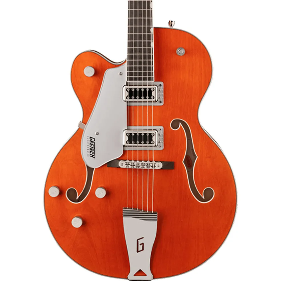 The G5420LH Electromatic® Classic Hollow Body Single-Cut features a laminated maple body with vintage-inspired perimeters and refined arches, as well as all-new trestle block bracing to help reduce unwanted feedback. By increasing rigidity and contact between the top and back of the body, the new trestle block design also results in the sound having a faster attack with more focus, snap, and increased sustain. Coupled with all-new FT-5E Filter’Tron™ pickups, this hollow build’s voice explodes with huge full-bodied punch, classic chime and enhanced presence, clarity and note definition.