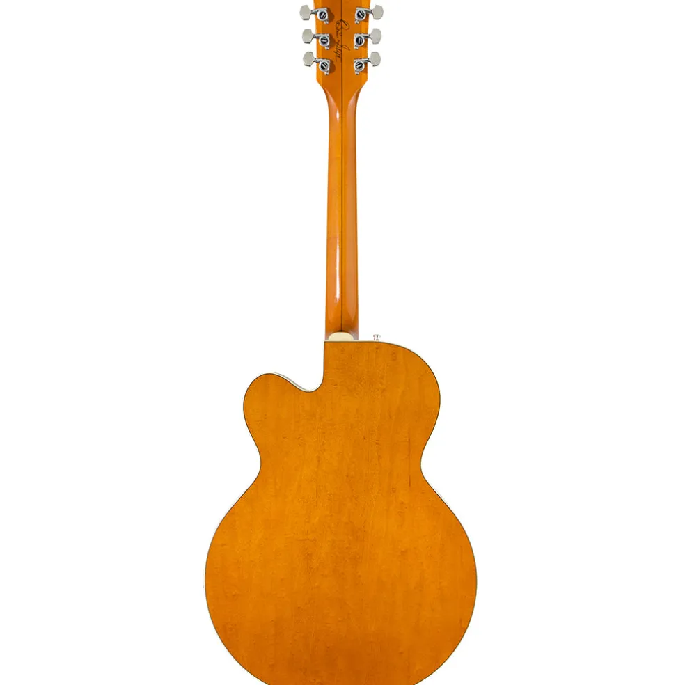 Beneath its vintage cloak however, Smoke is a true workhorse with features accumulated over a prolific span of Brian’s career. Stage-veteran specs include a single-cutaway hollow body with arched laminated maple top, 1959 trestle bracing and oversized F-holes for improved sonic projection. The maple neck has a 9.5-12” compound radius ebony fingerboard and a vintage ‘V’ neck shape for comfortable chording or lightning leads. The rolled fingerboard and body edges couple with the semi-gloss finish to create an unparalleled broken-in feel found only in the prized G6120s from the 1950s.