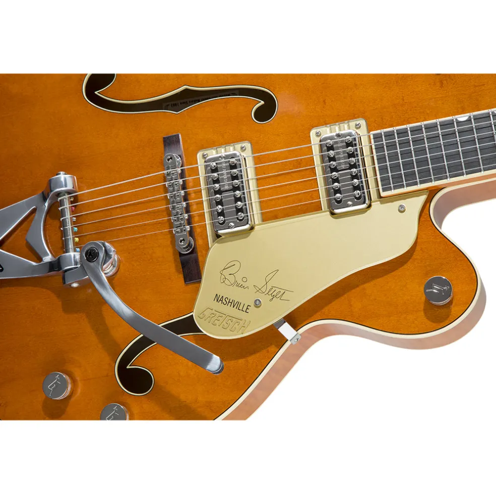 Honoring a pivotal rock ‘n’ roll legend, the G6120T-BSSMK Brian Setzer Signature Nashville® Hollow Body 59 “Smoke” with Bigsby® is a recreation of Brian’s main stage guitar since retiring the famed ‘Stray Cat.’ A painstaking homage to one of Brian’s most treasured guitars, Smoke delivers vintage 59 vibe with powerhouse performance.