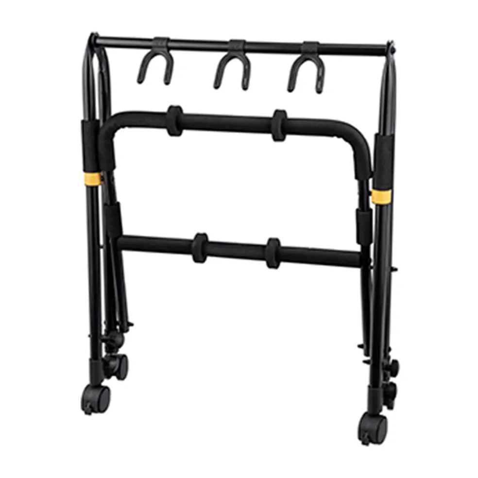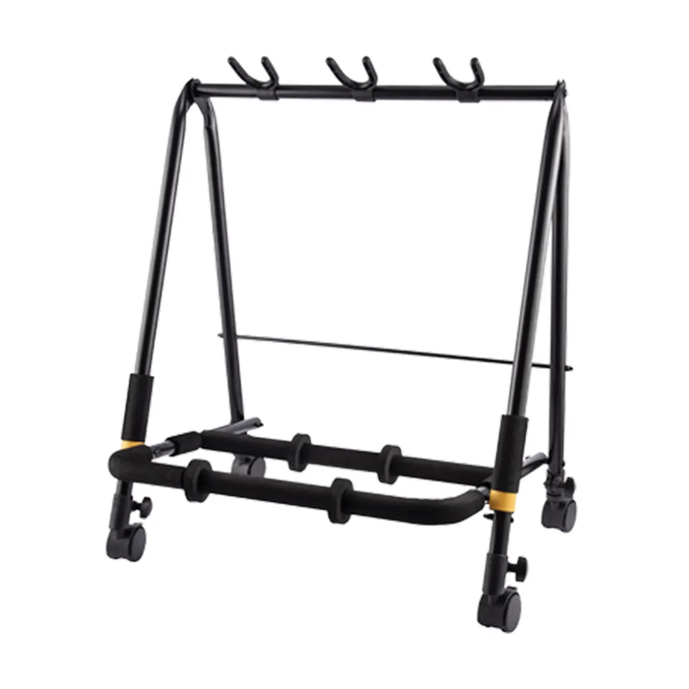 The GS523B PLUS HERCULES Multi-Guitar Rack with add-on casters accommodates three guitars and utilizes Specially Formulated Foam (SFF) padding to cover all contact points. HA205 allows expansion to accommodate up to 6 guitars.