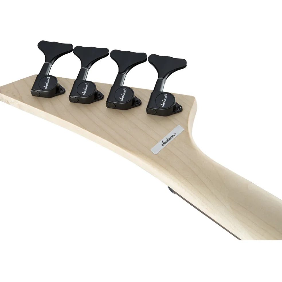 A Jackson P style neck pickup and Jackson J style bridge pickup power this 4-string bass, which also features a pair of volume knobs, single tone knob, hardtail bridge with black base plate and Jackson-branded tuners.