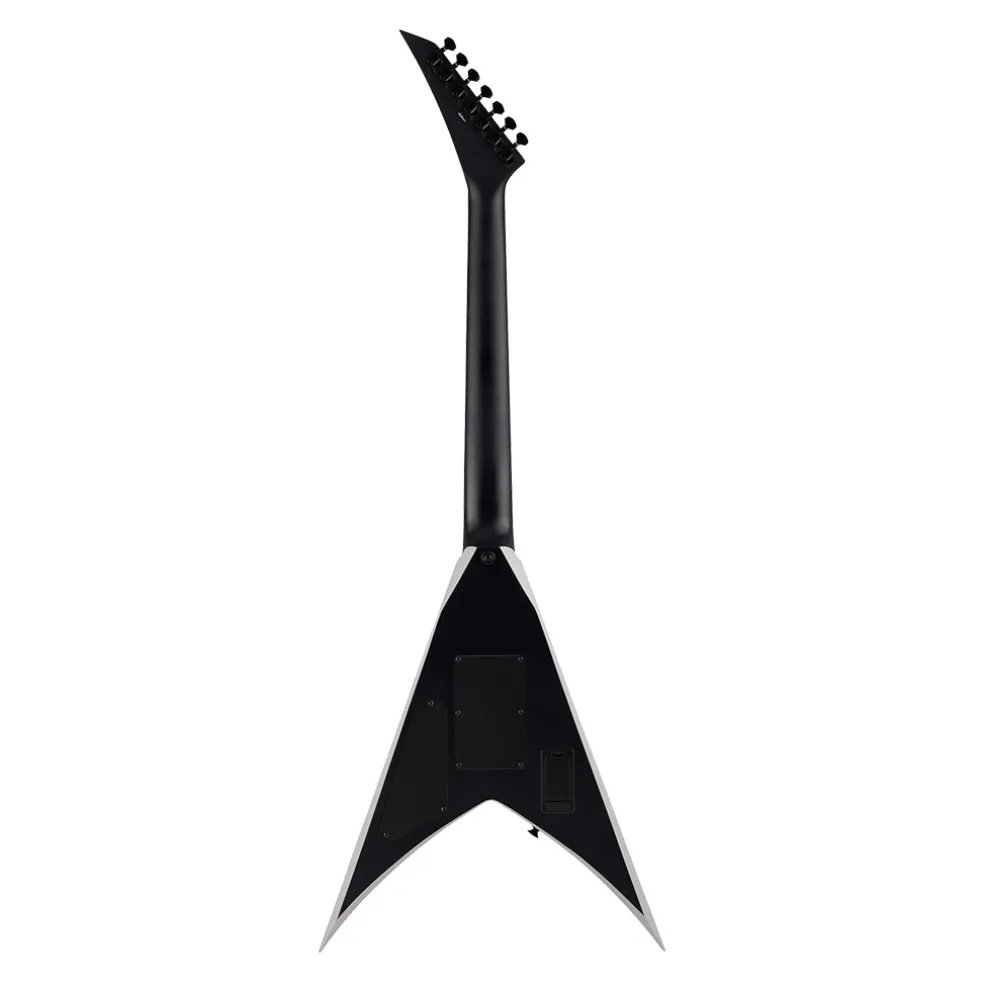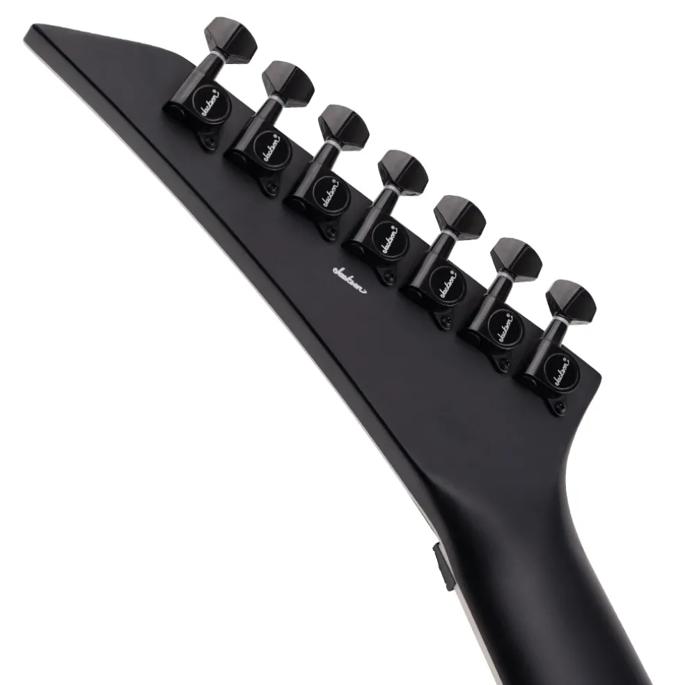 The Jackson® X Series King V™ KVX-MG7 has a poplar body, 26.5” scale length and through-body maple neck with scarf joint and graphite reinforcement to guard against climate-induced warping. Hosting 24 jumbo frets, the 12-16 compound radius bound laurel fingerboard curves more dramatically at the nut for easy chording and flattens out as it approaches the neck joint for low-action bends without fretting out.