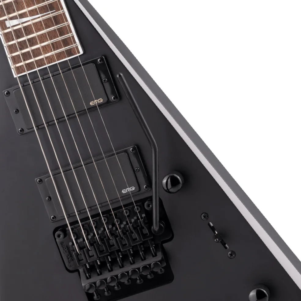Designed for a more extended sonic palette, this 7-string pointy guitar features active EMG® 81-7H bridge and EMG® 85-7H neck humbucking pickups that blend powerful intensity, fluid sustain and muscular growl for blistering leads that slice through even the densest mix. Command your sound with three-way pickup blade switching and single volume and tone controls, and bank on rock-solid tuning stability throughout the most of aggressive dive bombs or harmonic squeals with the Floyd Rose® Special 7-string double-locking tremolo bridge system.