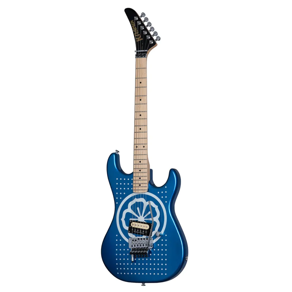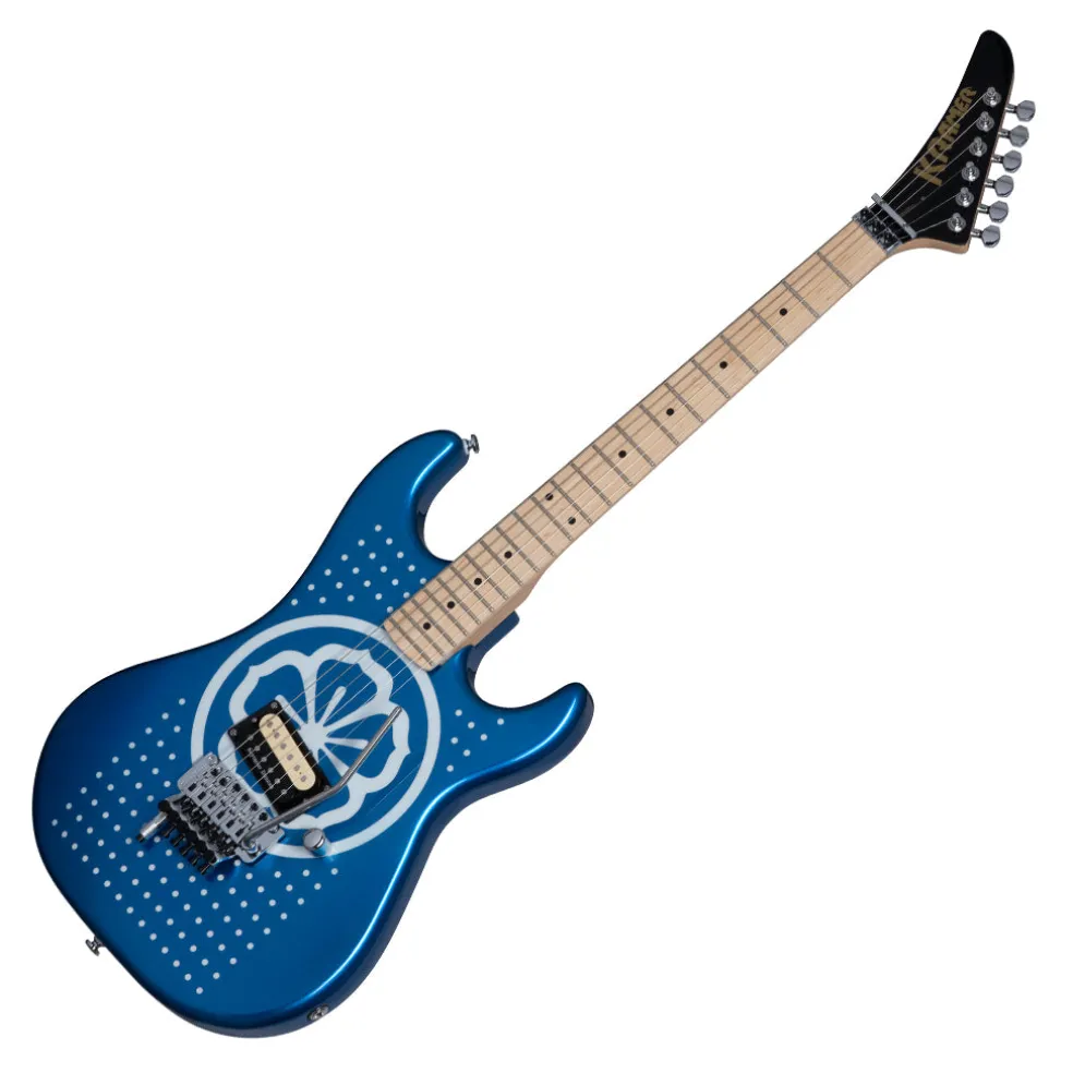 In many cultures, the lotus flower represents purity, enlightenment, regeneration, and rebirth. The Kramer Baretta “White Lotus” graphic was designed by Kramer Custom Graphic Artist Eric Caspers, who was inspired by movie underdogs from the 80s who overcame the odds to triumph in the end. The Baretta is a tribute to one of the most iconic and original guitar designs in rock. Features an alder body, satin-finished hard maple neck, a single Seymour Duncan® JB™ zebra-coil humbucker, and a Floyd Rose® 1000 series tremolo with an R2 1000 series locking nut. It also comes equipped with an EVH® D-Tuna® and a Floyd Rose LRT-L40 Trem Stop, and it is finished in an eye-catching White Lotus Candy Blue.