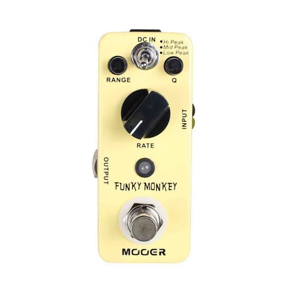 The Funky Monkey offers a wide range of auto wah effects. There are 3 peak modes: Hi, Mid, and Low. Adjust the Range, Q and Rate controls to dial in your auto wah sound.