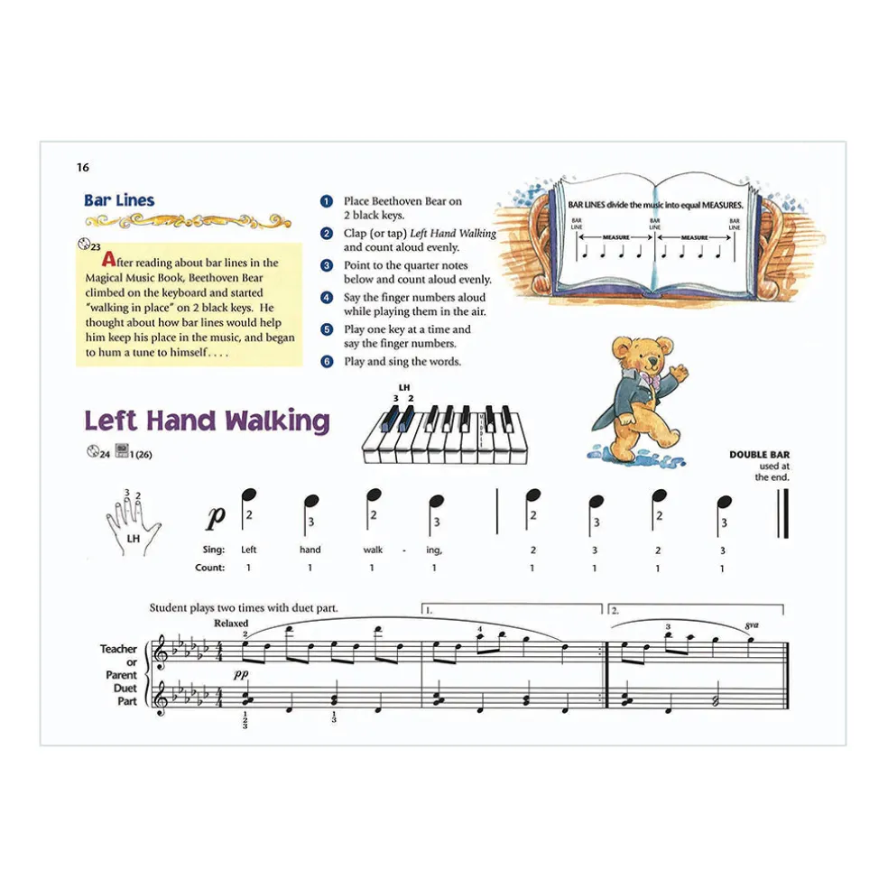Lesson Book 1 is pre-reading. Concepts taught are: How to sit at the piano; Correct hand position; High and low; Loud and soft (forte and piano); Keyboard topography; Bar line and measure, Quarter, half, whole notes and rests; and Repeat signs. The first pieces in the book are played on the black keys. Later in the book, C D E for the RH and C B A for the LH (Middle C position) are taught with letter notes (the name of the note is written inside the note head).