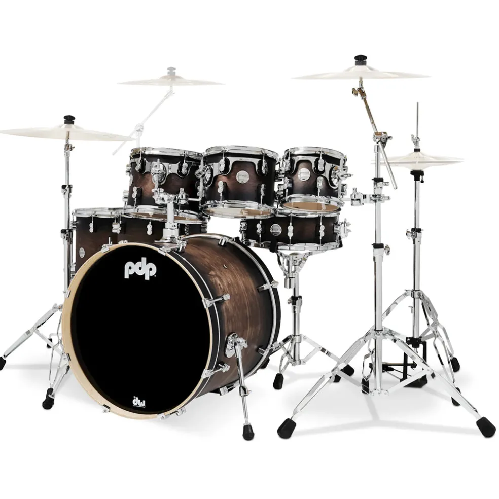 This 7-piece PDP shell pack is sized for arenas with 7×8′, 8×10′, and 9×12 mounted toms, 12×14′ and 14×16′ floor toms, 5.5×14 snare, 18×22′ bass drum, and an HW815 hardware (PDSP400 Single Bass Drum Pedal, PDSS800 Snare Stand, PDHH800-01 3-Legged Hi-Hat Stand, PDCS800 Straight Cymbal Stand, PDCB800 Boom Cymbal Stand).